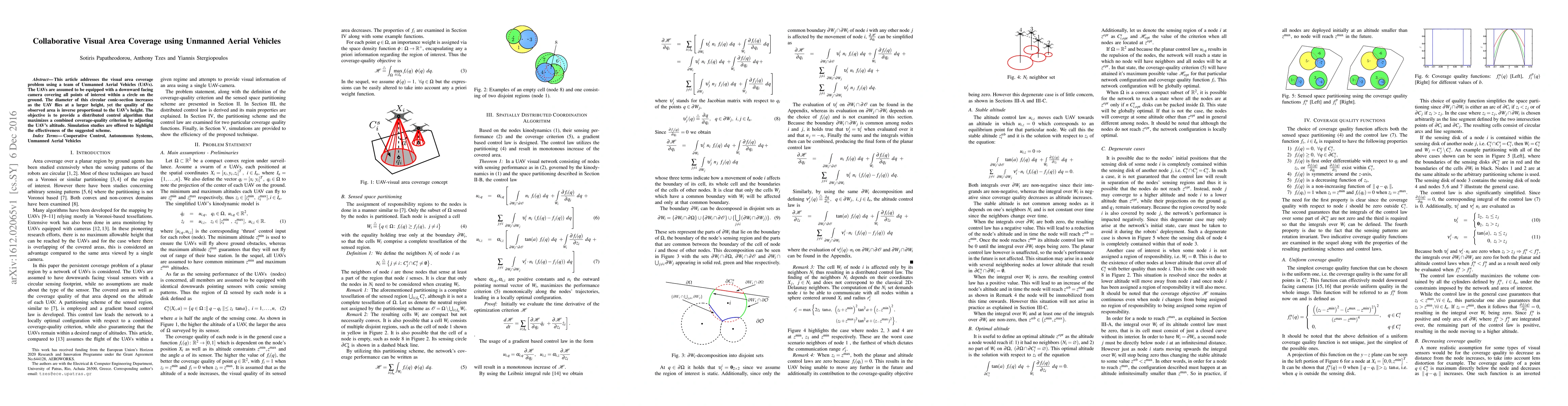 This article addresses the visual area coverage problem using a team of Unmanned Aerial Vehicles (UAVs). The UAVs are assumed to be equipped with a downward facing camera covering all points of interest within a circle on the ground. The diameter of this circular conic-section increases as the UAV flies at a larger height, yet the quality of the observed area is inverse proportional to the UAV's height. The objective is to provide a distributed control algorithm that maximizes a combined coverage-quality criterion by adjusting the UAV's altitude. Simulation studies are offered to highlight the effectiveness of the suggested scheme.