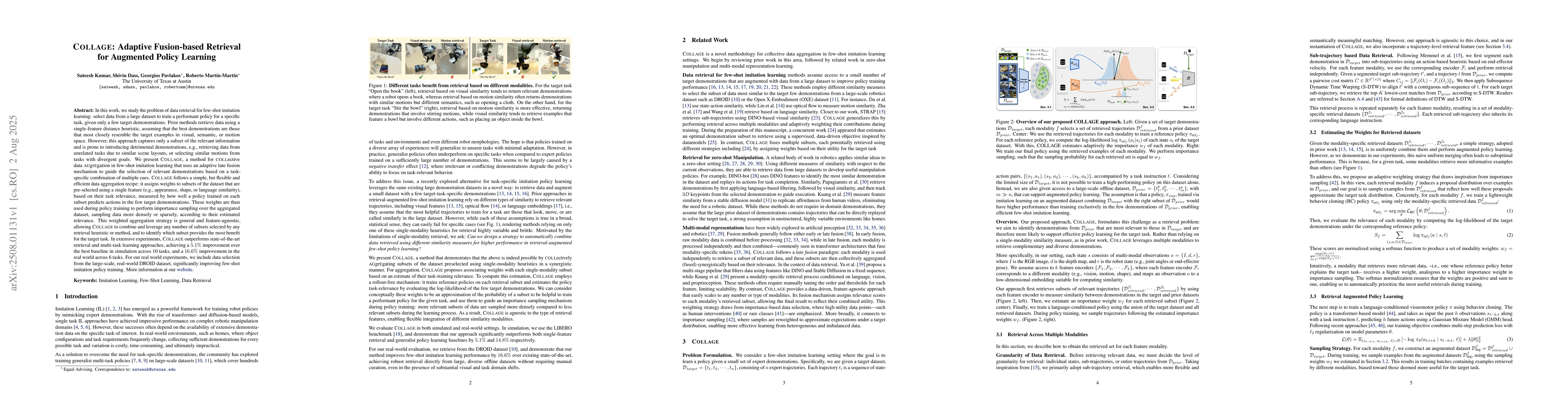 The paper presents COLLAGE, a method for adaptive fusion-based retrieval in few-shot imitation learning, which combines data from multiple modalities using task-specific weighted importance sampling.