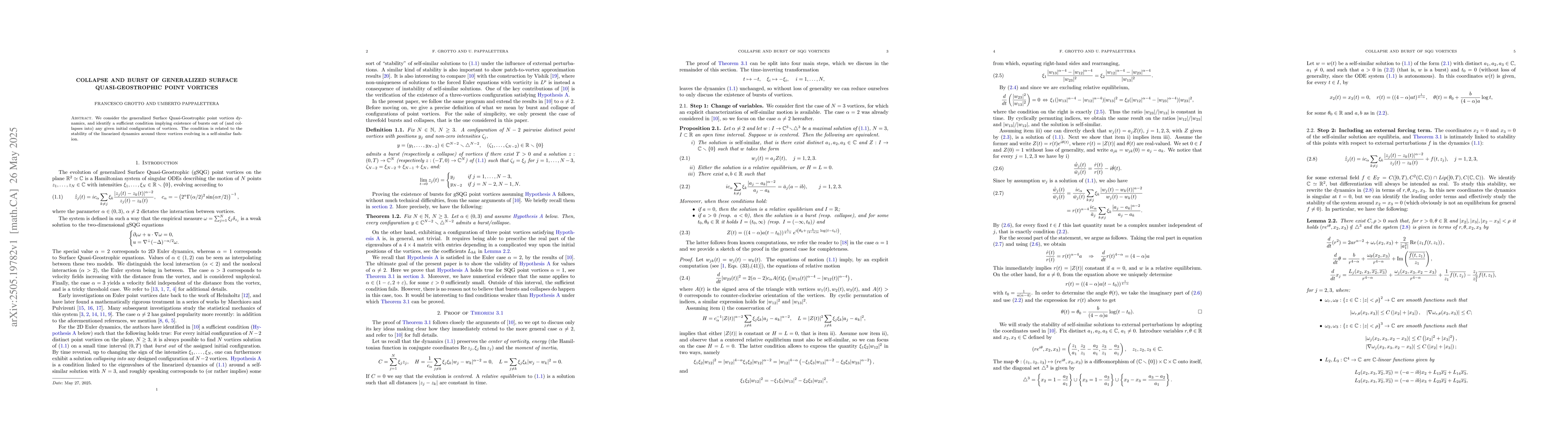 The research methodology involves analyzing the dynamics of generalized Surface Quasi-Geostrophic point vortices and identifying a sufficient condition for bursts out of any initial configuration, linked to the stability of linearized dynamics around three evolving vortices in a self-similar fashion.