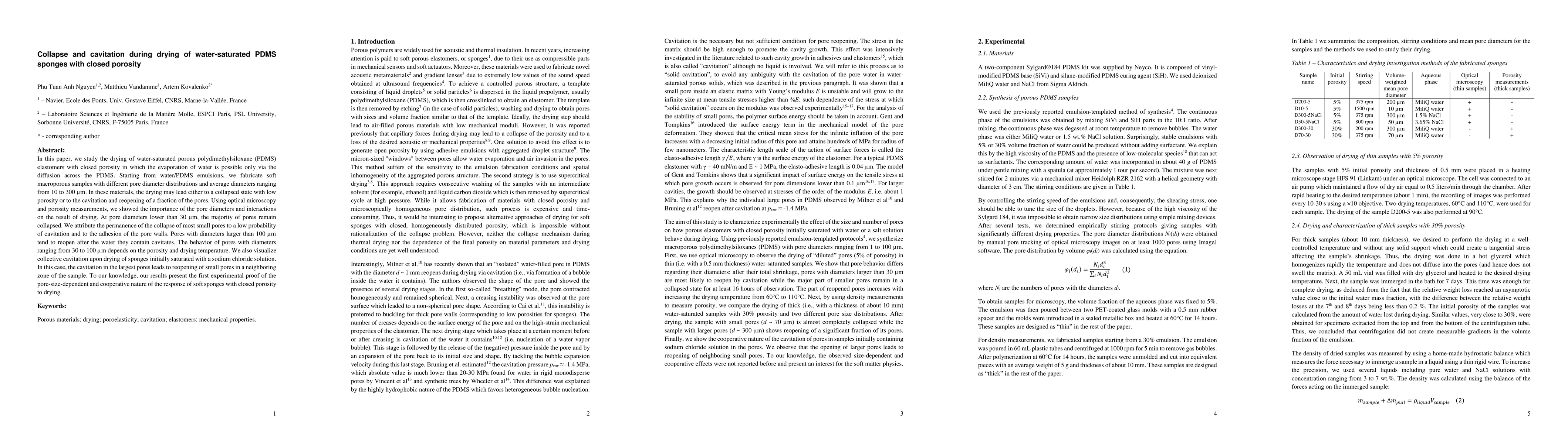 This paper investigates the drying behavior of water-saturated PDMS sponges with closed porosity, revealing that pore diameter significantly influences whether pores collapse or cavitate upon drying. Small pores (<30 µm) tend to collapse due to low cavitation probability and wall adhesion, while larger pores (>100 µm) often reopen after cavitation.
