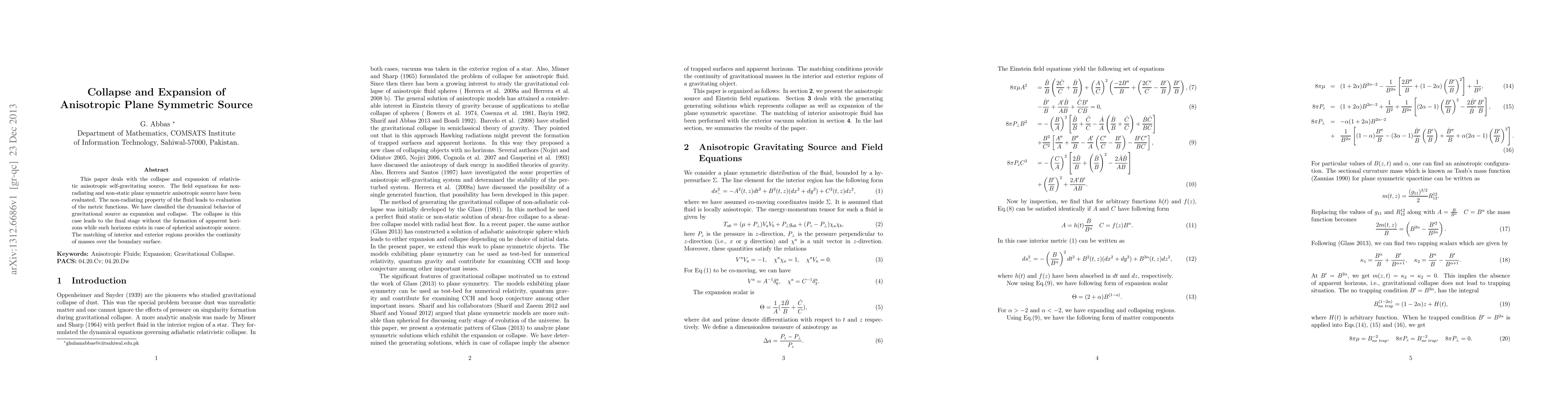 This paper deals with the collapse and expansion of relativistic anisotropic self-gravitating source. The field equations for non-radiating and non-static plane symmetric anisotropic source have been evaluated. The non-radiating property of the fluid leads to evaluation of the metric functions. We have classified the dynamical behavior of gravitational source as expansion and collapse. The collapse in this case leads to the final stage without the formation of apparent horizons while such horizons exists in case of spherical anisotropic source. The matching of interior and exterior regions provides the continuity of masses over the boundary surface.