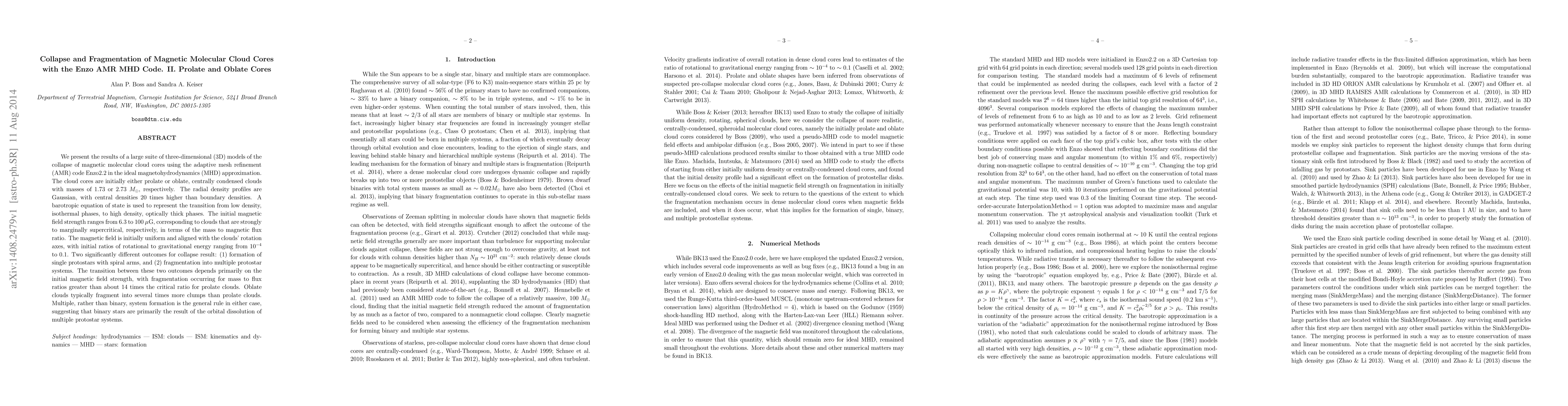This study uses the Enzo AMR MHD code to simulate the collapse of magnetic molecular cloud cores, finding that prolate and oblate cores can either form single protostars with spiral arms or fragment into multiple protostar systems, with the outcome primarily dependent on the initial magnetic field strength and mass to flux ratio.