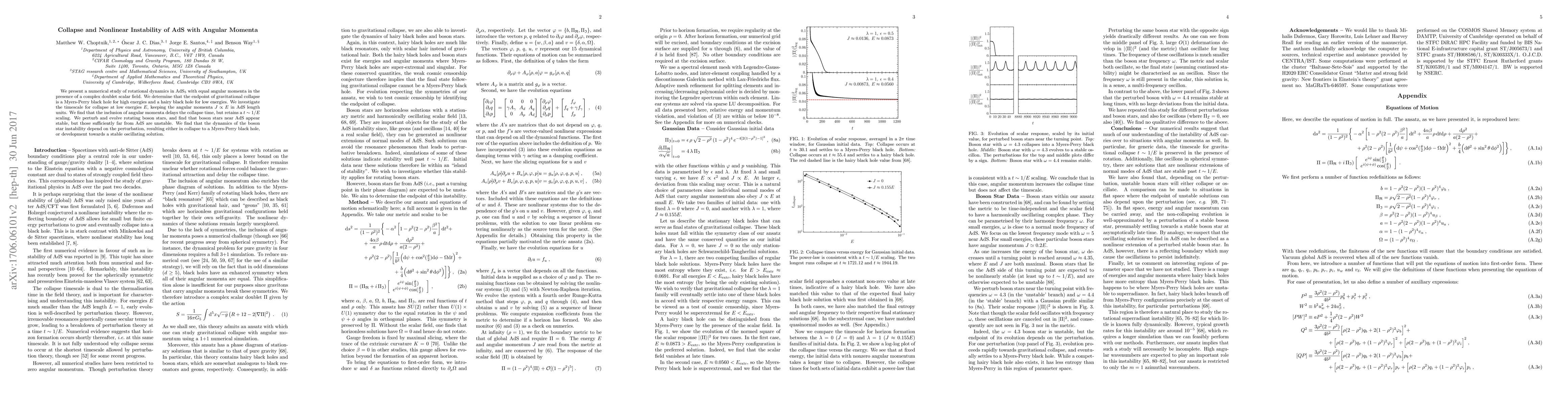 This paper studies the rotational dynamics in AdS$_5$ with angular momenta and a complex doublet scalar field, finding that high energies lead to Myers-Perry black holes, while low energies result in hairy black holes. The inclusion of angular momenta delays collapse but maintains a $t\sim1/E$ scaling. Boson stars near AdS are stable, while those far from AdS are unstable, potentially collapsing to black holes or oscillating stably.