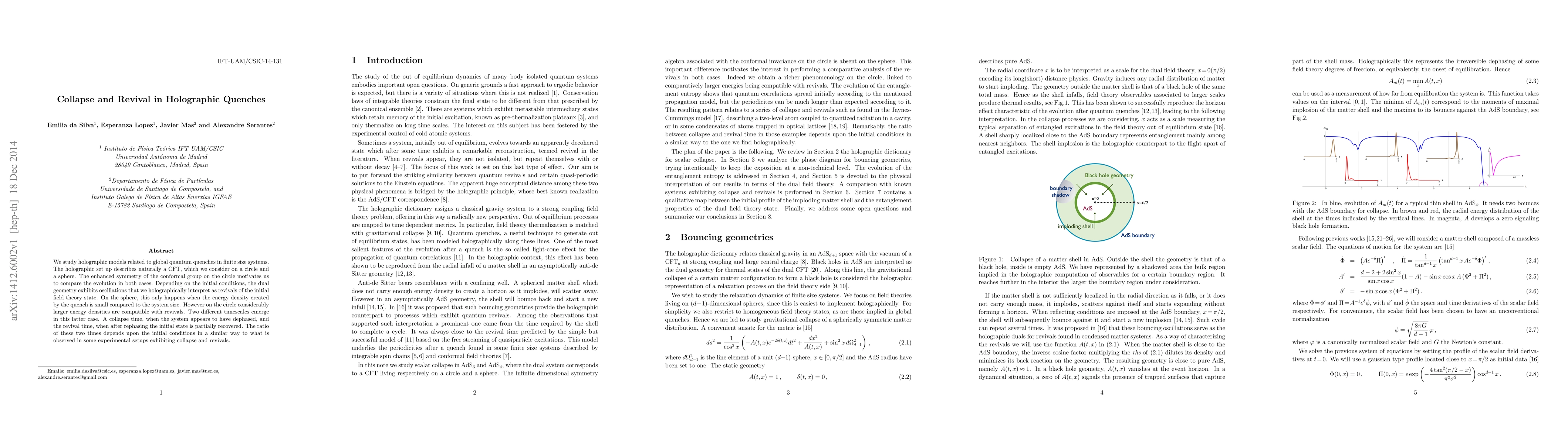 We study holographic models related to global quantum quenches in finite size systems. The holographic set up describes naturally a CFT, which we consider on a circle and a sphere. The enhanced symmetry of the conformal group on the circle motivates us to compare the evolution in both cases. Depending on the initial conditions, the dual geometry exhibits oscillations that we holographically interpret as revivals of the initial field theory state. On the sphere, this only happens when the energy density created by the quench is small compared to the system size. However on the circle considerably larger energy densities are compatible with revivals. Two different timescales emerge in this latter case. A collapse time, when the system appears to have dephased, and the revival time, when after rephasing the initial state is partially recovered. The ratio of these two times depends upon the initial conditions in a similar way to what is observed in some experimental setups exhibiting collapse and revivals.
