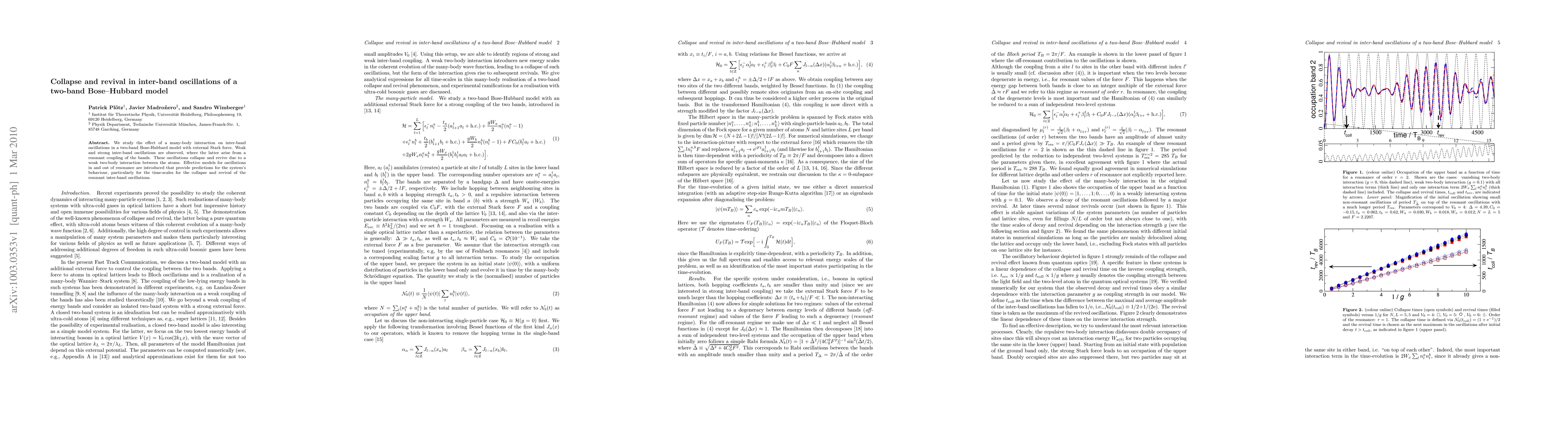 We study the effect of a many-body interaction on inter-band oscillations in a two-band Bose-Hubbard model with external Stark force. Weak and strong inter-band oscillations are observed, where the latter arise from a resonant coupling of the bands. These oscillations collapse and revive due to a weak two-body interaction between the atoms. Effective models for oscillations in and out of resonance are introduced that provide predictions for the system's behaviour, particularly for the time-scales for the collapse and revival of the resonant inter-band oscillations.
