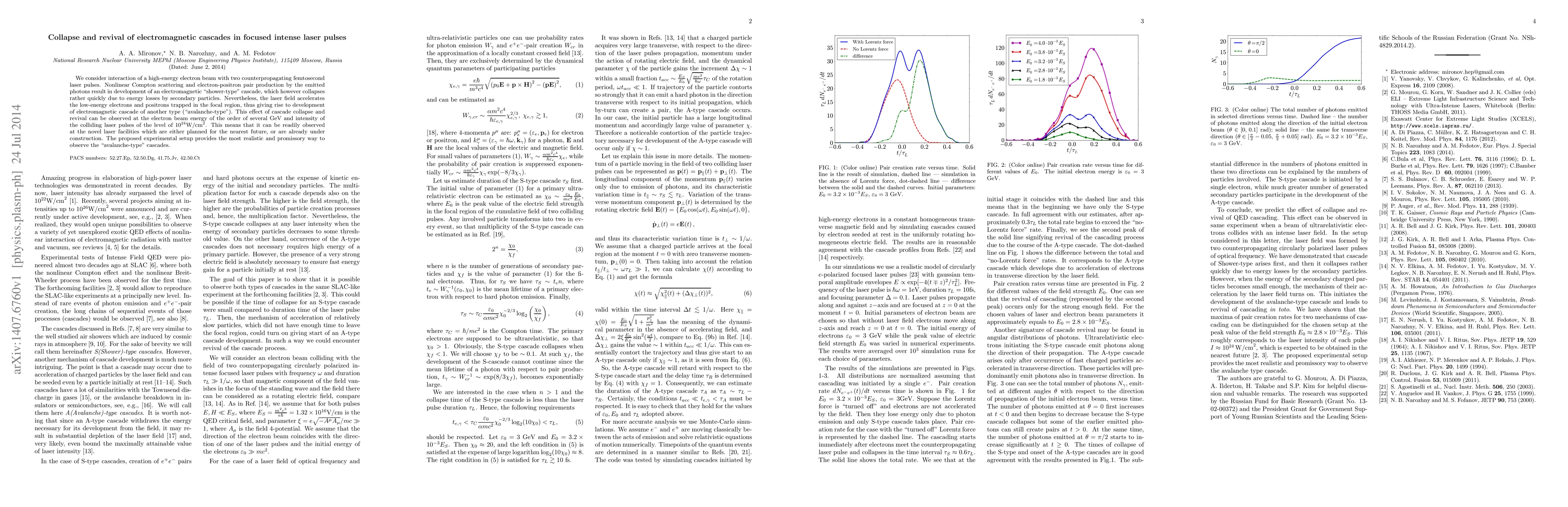 We consider interaction of a high-energy electron beam with two counterpropagating femtosecond laser pulses. Nonlinear Compton scattering and electron-positron pair production by the emitted photons result in development of an electromagnetic "shower-type" cascade, which however collapses rather quickly due to energy losses by secondary particles. Nevertheless, the laser field accelerates the low-energy electrons and positrons trapped in the focal region, thus giving rise to development of electromagnetic cascade of another type ("avalanche-type"). This effect of cascade collapse and revival can be observed at the electron beam energy of the order of several GeV and intensity of the colliding laser pulses of the level of $10^{24}$W/cm$^2$. This means that it can be readily observed at the novel laser facilities which are either planned for the nearest future, or are already under construction. The proposed experimental setup provides the most realistic and promissory way to observe the "avalanche-type" cascades.