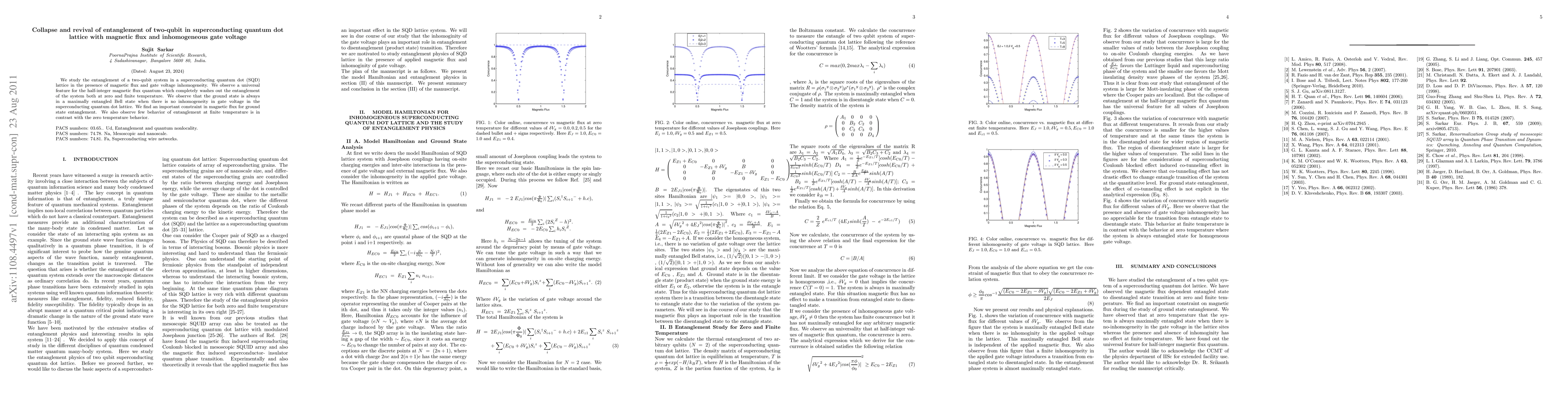 We study the entanglement of a two-qubit system in a superconducting quantum dot (SQD) lattice in the presence of magnetic flux and gate voltage inhomogeneity. We observe a universal feature for the half-integer magnetic flux quantum which completely washes out the entanglement of the system both at zero and finite temperature. We observe that the ground state is always in a maximally entangled Bell state when there is no inhomogeneity in gate voltage in the superconducting quantum dot lattice. We find an important constraint in magnetic flux for ground state entanglement. We also observe few behavior of entanglement at finite temperature is in contrast with the zero temperature behavior.