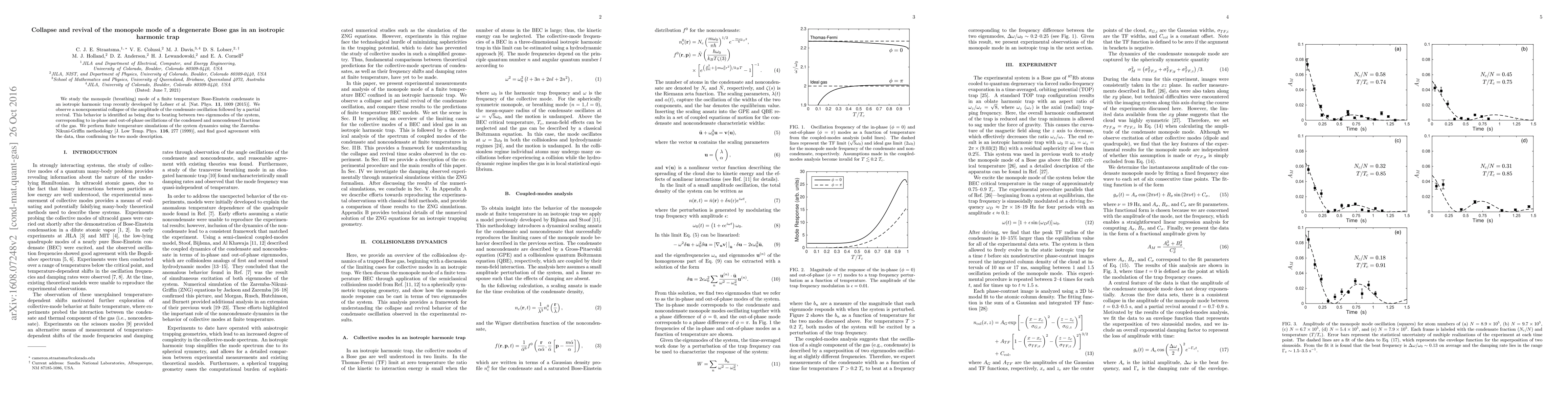 This paper investigates the monopole mode of a finite temperature Bose-Einstein condensate in an isotropic harmonic trap, observing a nonexponential collapse and partial revival of the oscillation amplitude due to beating between two eigenmodes. Simulations using the Zaremba-Nikuni-Griffin methodology confirm the two-mode description.