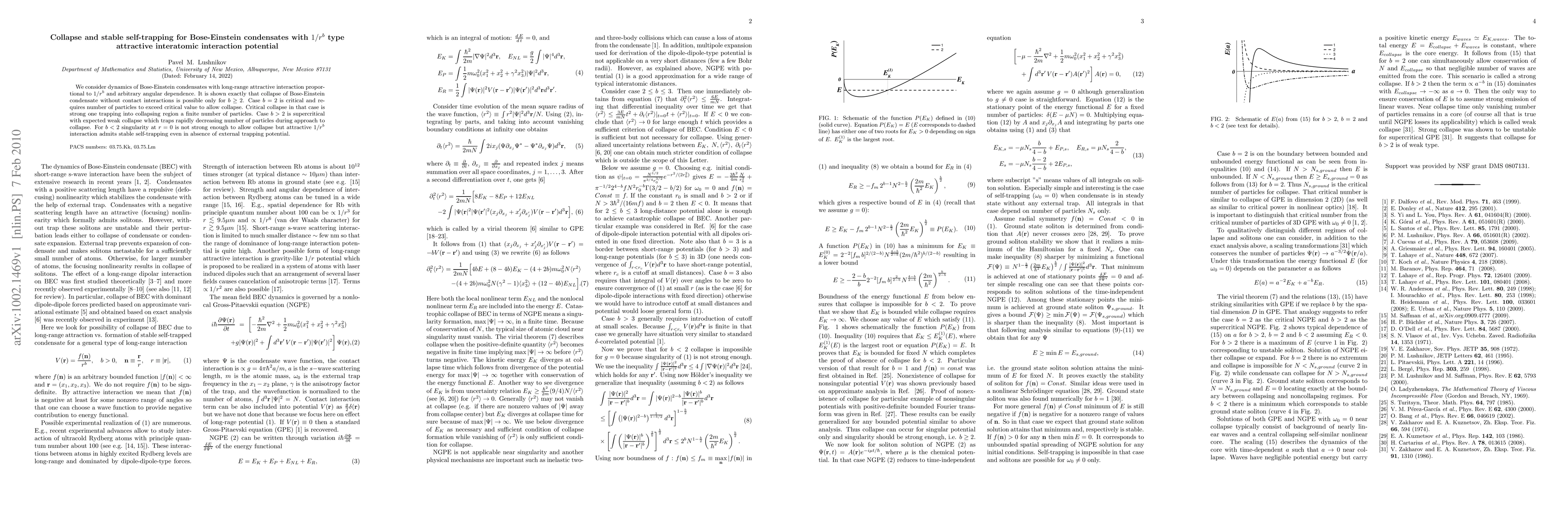 We consider dynamics of Bose-Einstein condensates with long-range attractive interaction proportional to $1/r^b$ and arbitrary angular dependence. It is shown exactly that collapse of Bose-Einstein condensate without contact interactions is possible only for $b\ge 2$. Case $b=2$ is critical and requires number of particles to exceed critical value to allow collapse. Critical collapse in that case is strong one trapping into collapsing region a finite number of particles. Case $b>2$ is supercritical with expected weak collapse which traps rapidly decreasing number of particles during approach to collapse. For $b<2$ singularity at $r=0$ is not strong enough to allow collapse but attractive $1/r^b$ interaction admits stable self-trapping even in absence of external trapping potential.