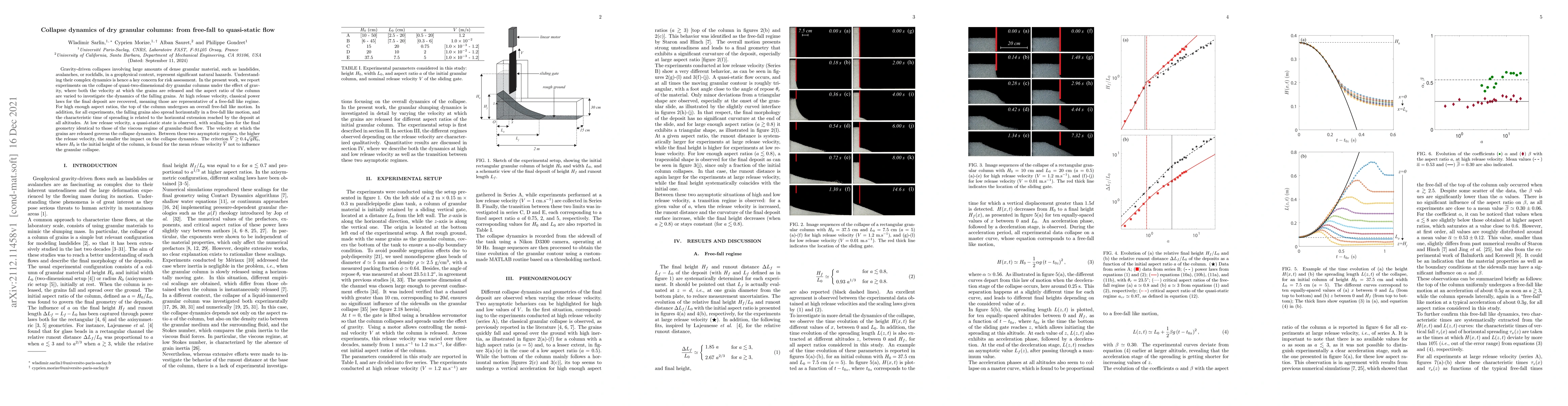 This paper investigates the dynamics of gravity-driven collapses of dry granular columns, finding that high release velocity leads to free-fall-like motion, while low release velocity results in quasi-static flow. The study identifies a critical velocity criterion for the release velocity to not influence the collapse dynamics.