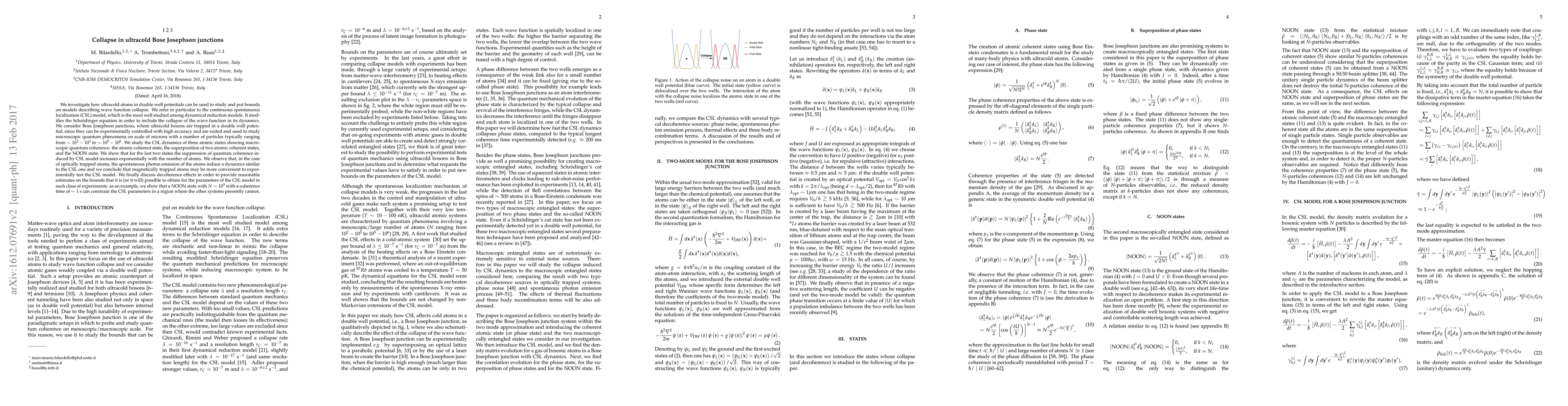 The research investigates the use of ultracold Bose Josephson junctions to study and bound models describing wave function collapse, specifically the Continuous Spontaneous Localization (CSL) model. This is achieved by analyzing the dynamics of three atomic states: atomic coherent state, superposition of two atomic coherent states, and the NOON state.