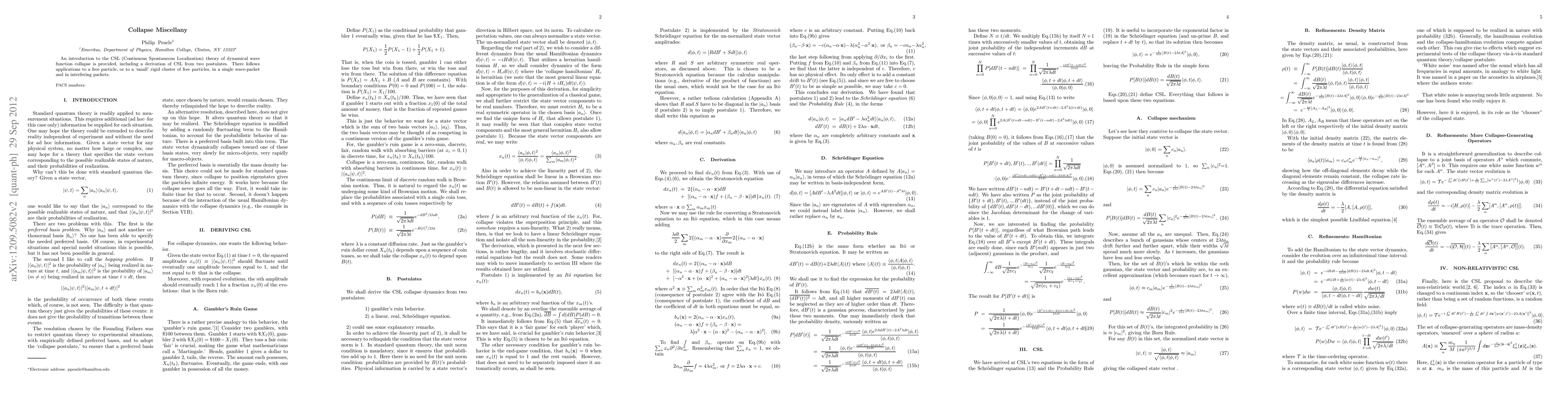 An introduction to the CSL (Continuous Spontaneous Localization) theory of dynamical wave function collapse is provided, including a derivation of CSL from two postulates. There follows applications to a free particle, or to a `small' rigid cluster of free particles, in a single wave-packet and in interfering packets.