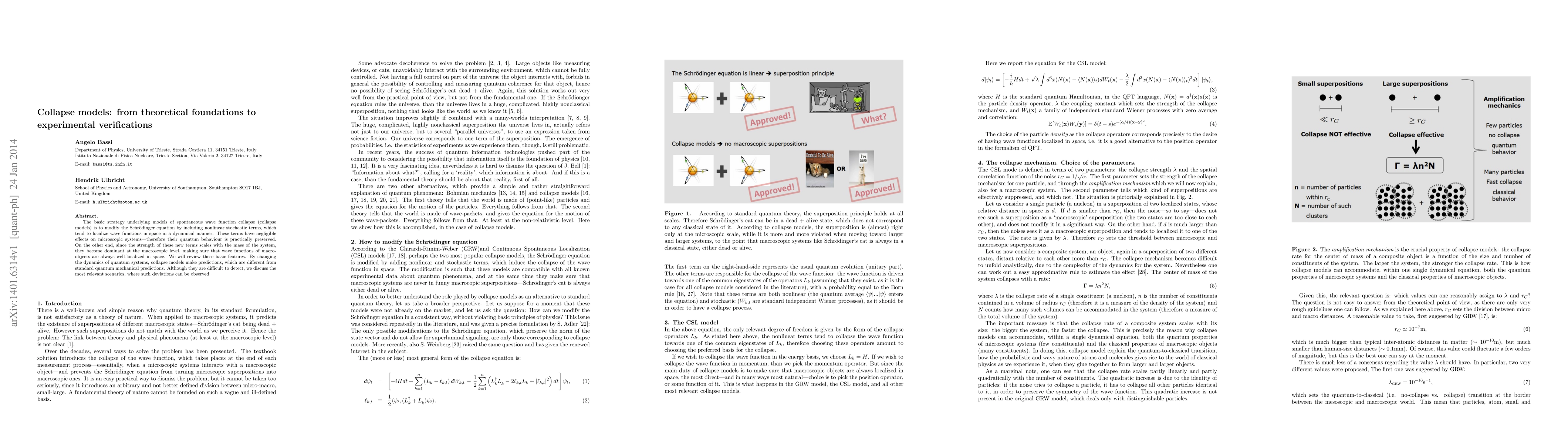 Collapse models modify the Schroedinger equation with nonlinear stochastic terms to predict macroscopic wave function localization, diverging from standard quantum mechanical predictions.