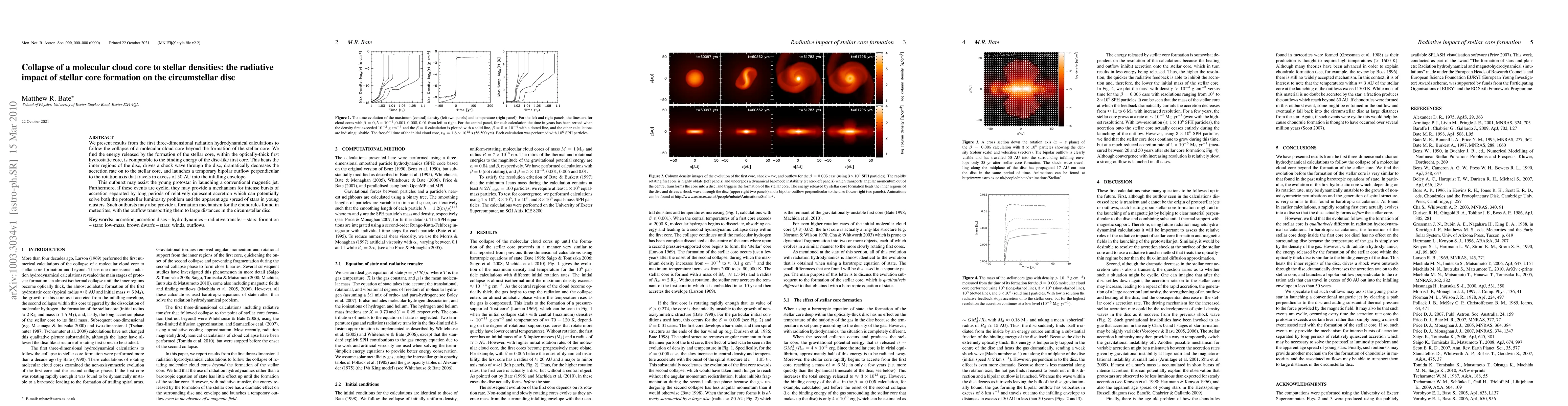 This paper reports on three-dimensional radiation hydrodynamical simulations showing that the energy from stellar core formation heats the circumstellar disc, drives a shock wave, and launches a bipolar outflow, potentially aiding in magnetic jet formation and explaining protostellar luminosity and age spread issues.