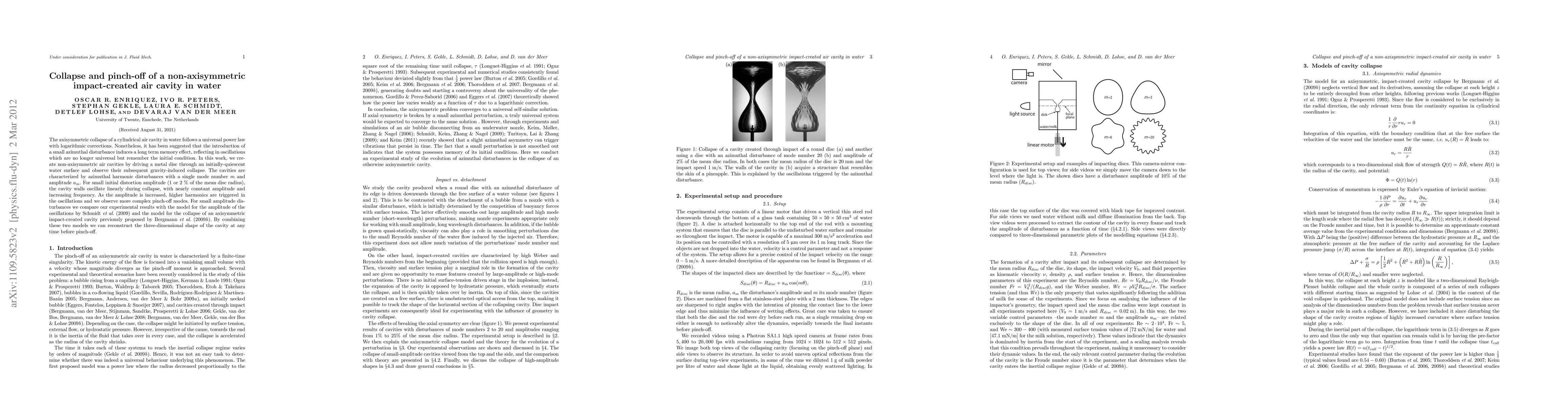 The axisymmetric collapse of a cylindrical air cavity in water follows a universal power law with logarithmic corrections. Nonetheless, it has been suggested that the introduction of a small azimuthal disturbance induces a long term memory effect, reflecting in oscillations which are no longer universal but remember the initial condition. In this work, we create non-axisymmetric air cavities by driving a metal disc through an initially-quiescent water surface and observe their subsequent gravity-induced collapse. The cavities are characterized by azimuthal harmonic disturbances with a single mode number $m$ and amplitude $a_m$. For small initial distortion amplitude (1 or 2% of the mean disc radius), the cavity walls oscillate linearly during collapse, with nearly constant amplitude and increasing frequency. As the amplitude is increased, higher harmonics are triggered in the oscillations and we observe more complex pinch-off modes. For small amplitude disturbances we compare our experimental results with the model for the amplitude of the oscillations by Schmidt et al. (2009) and the model for the collapse of an axisymmetric impact-created cavity previously proposed by Bergmann et al. (2009b). By combining these two models we can reconstruct the three-dimensional shape of the cavity at any time before pinch-off.