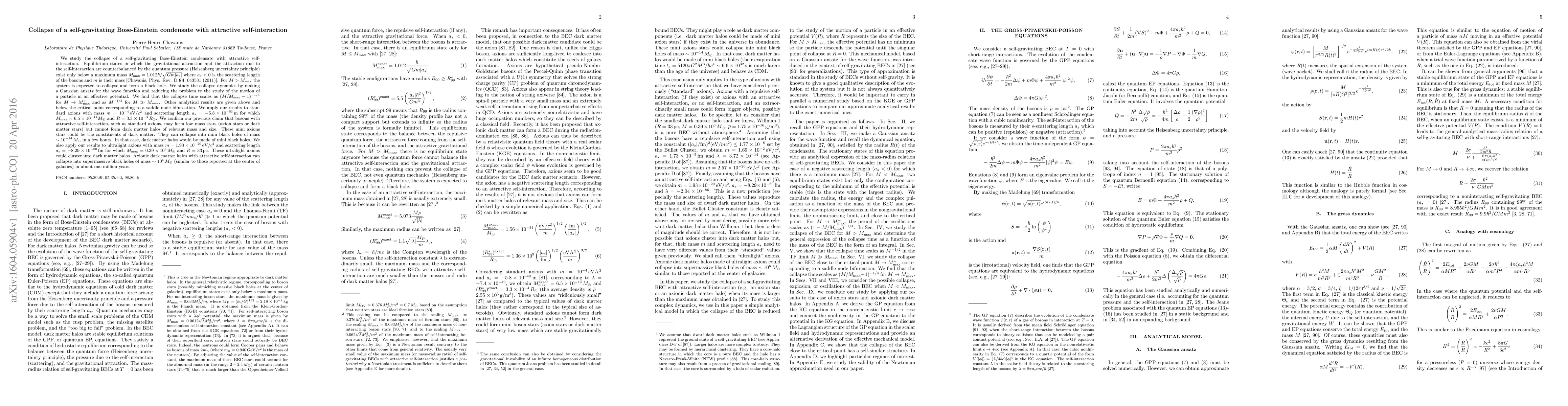 We study the collapse of a self-gravitating Bose-Einstein condensate with attractive self-interaction. Equilibrium states in which the gravitational attraction and the attraction due to the self-interaction are counterbalanced by the quantum pressure exist only below a maximum mass $M_{\rm max}=1.012\hbar/\sqrt{Gm|a_s|}$ where $a_s<0$ is the scattering length of the bosons and $m$ is their mass. For $M>M_{\rm max}$ the system is expected to collapse and form a black hole. We study the collapse dynamics by making a Gaussian ansatz for the wave function. We find that the collapse time scales as $(M/M_{\rm max}-1)^{-1/4}$ for $M\rightarrow M_{\rm max}^+$ and as $M^{-1/2}$ for $M\gg M_{\rm max}$. We apply our results to standard axions with mass $m=10^{-4}\, {\rm eV}/c^2$ and scattering length $a_s=-5.8\times 10^{-53}\, {\rm m}$ for which $M_{\rm max}=6.5\times 10^{-14}M_{\odot}$ and $R=3.3\times 10^{-4}\, R_{\odot}$. We confirm our previous claim that bosons with attractive self-interaction, such as standard axions, may form low mass stars but cannot form dark matter halos of relevant mass and size. These mini axions stars could be the constituents of dark matter. They can collapse into mini black holes of mass $\sim 10^{-14}\, M_{\odot}$ in a few hours. In that case, dark matter halos would be made of mini black holes. We also apply our results to ultralight axions with mass $m=1.93\times 10^{-20}\, {\rm eV}/c^2$ and scattering length $a_s=-8.29\times 10^{-60}\, {\rm fm}$ for which $M_{\rm max}=0.39\times 10^6\, M_{\odot}$ and $R=33\, {\rm pc}$. These ultralight axions could cluster into dark matter halos. Axionic dark matter halos with attractive self-interaction can collapse into supermassive black holes of mass $\sim 10^{6}\, M_{\odot}$ in about one million years.