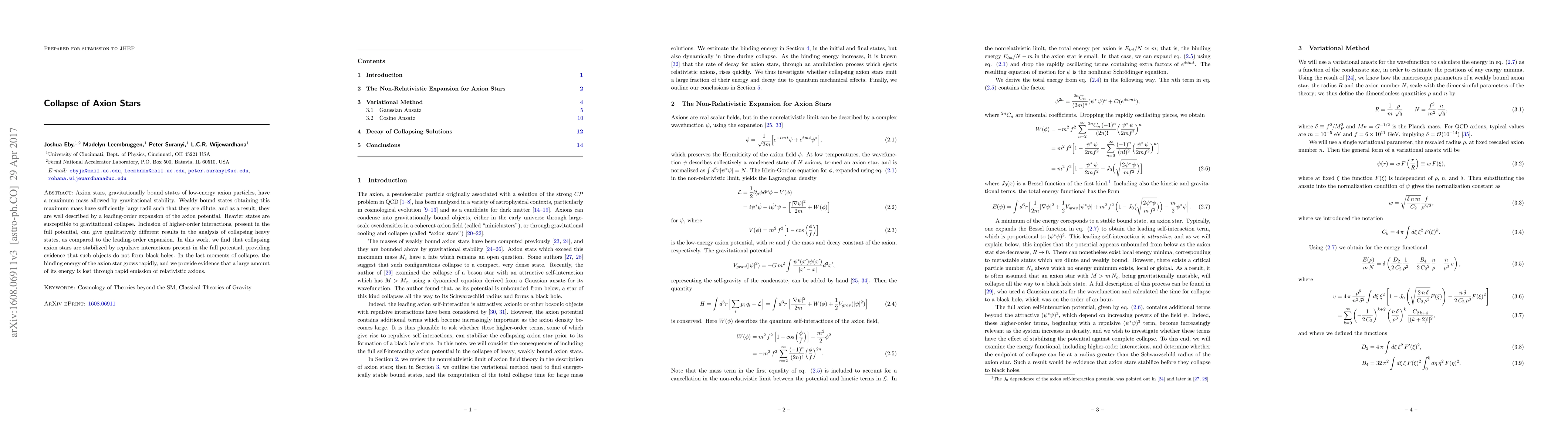 This research explores the gravitational collapse of axion stars, finding that higher-order interactions in their full potential stabilize heavy axion stars, preventing black hole formation. The study concludes that in the final moments of collapse, a significant portion of the star's energy is rapidly emitted as relativistic axions.