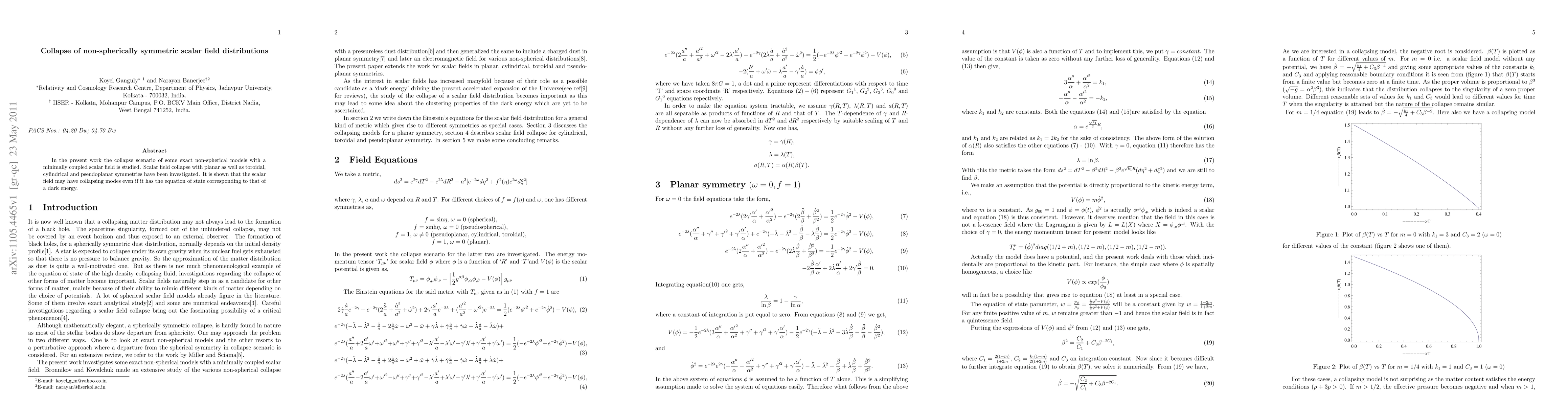 Summary: This paper explores the collapse dynamics of non-spherically symmetric scalar field distributions, revealing that such fields can exhibit collapsing modes even with dark energy-like equations of state, across various symmetries including planar, toroidal, cylindrical, and pseudoplanar.