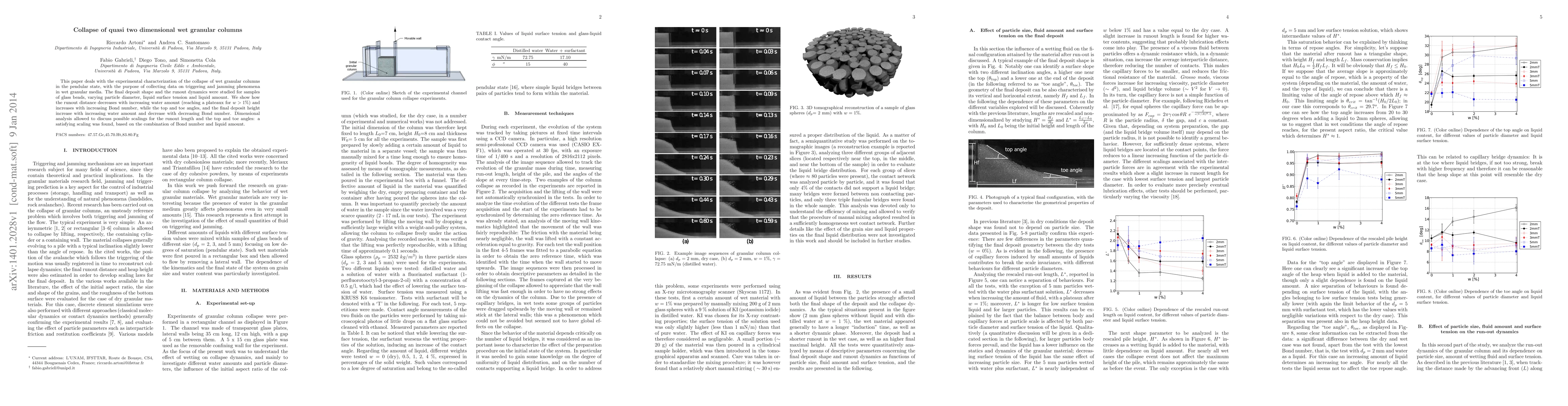 The paper presents an experimental characterization of wet granular column collapse, identifying key parameters influencing runout dynamics and deposit shape, and proposing a scaling parameter (Bo−1w2/3) for runout length, top and toe angles.