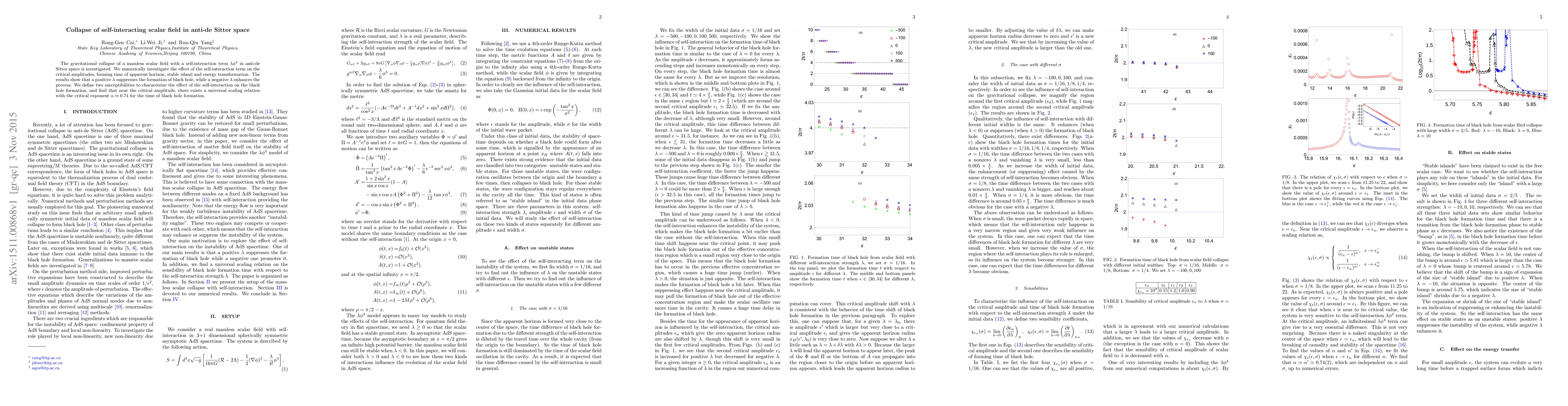 The paper investigates the gravitational collapse of a massless scalar field with self-interactions in anti-de Sitter space, finding that positive self-interaction suppresses black hole formation while negative self-interaction enhances it, with a universal scaling relation near the critical amplitude.