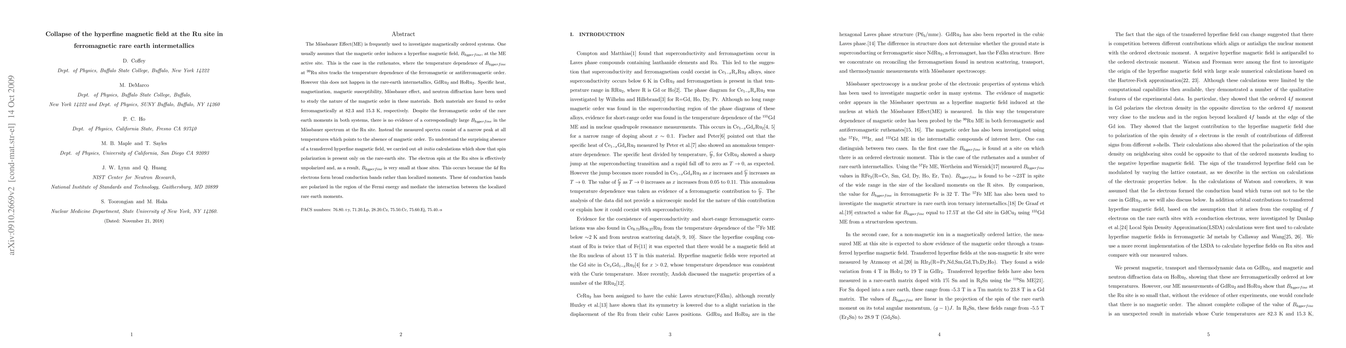 The M\"{o}ssbauer Effect(ME) is frequently used to investigate magnetically ordered systems. One usually assumes that the magnetic order induces a hyperfine magnetic field, $B_{hyperfine}$, at the ME active site. This is the case in the ruthenates, where the temperature dependence of $B_{hyperfine}$ at $^{99}$Ru sites tracks the temperature dependence of the ferromagnetic or antiferromagnetic order. However this does not happen in the rare-earth intermetallics, GdRu$_2$ and HoRu$_2$. Specific heat, magnetization, magnetic susceptibility, M\"{o}ssbauer effect, and neutron diffraction have been used to study the nature of the magnetic order in these materials. Both materials are found to order ferromagnetically at 82.3 and 15.3 K, respectively. Despite the ferromagnetic order of the rare earth moments in both systems, there is no evidence of a correspondingly large $B_{hyperfine}$ in the M\"{o}ssbauer spectrum at the Ru site. Instead the measured spectra consist of a narrow peak at all temperatures which points to the absence of magnetic order. To understand the surprising absence of a transferred hyperfine magnetic field, we carried out {\it ab initio} calculations which show that spin polarization is present only on the rare-earth site. The electron spin at the Ru sites is effectively unpolarized and, as a result, $B_{hyperfine}$ is very small at those sites. This occurs because the 4$d$ Ru electrons form broad conduction bands rather than localized moments. These 4$d$ conduction bands are polarized in the region of the Fermi energy and mediate the interaction between the localized rare earth moments.