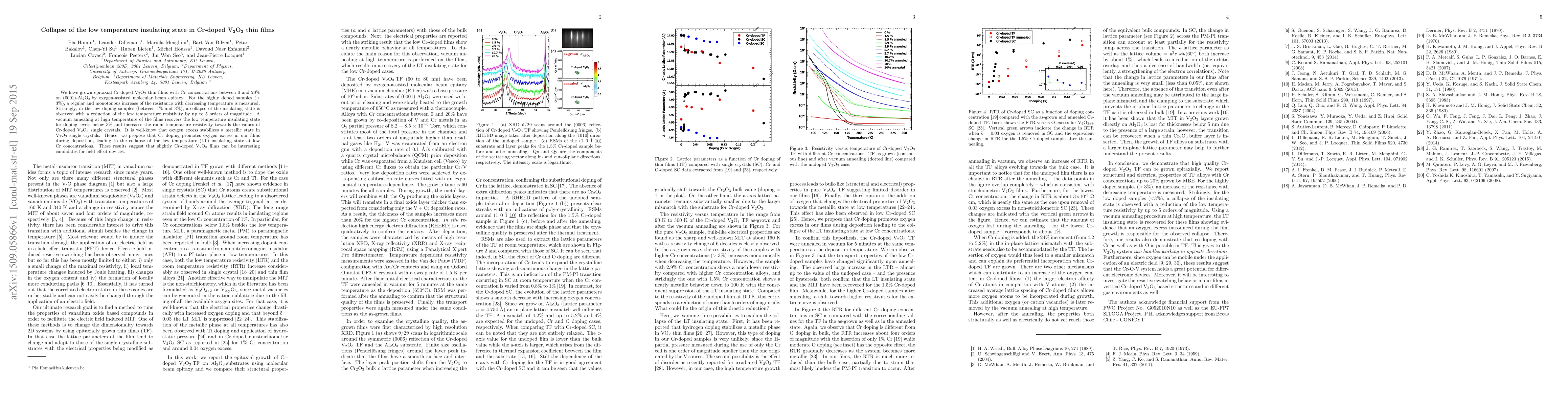 This study explores Cr-doped V$_2$O$_3$ thin films, finding that low doping levels (1%-3%) cause a collapse of the low temperature insulating state, while high doping levels show increased resistance. Vacuum annealing restores the insulating state and increases room temperature resistivity, suggesting Cr doping induces oxygen excess during deposition.