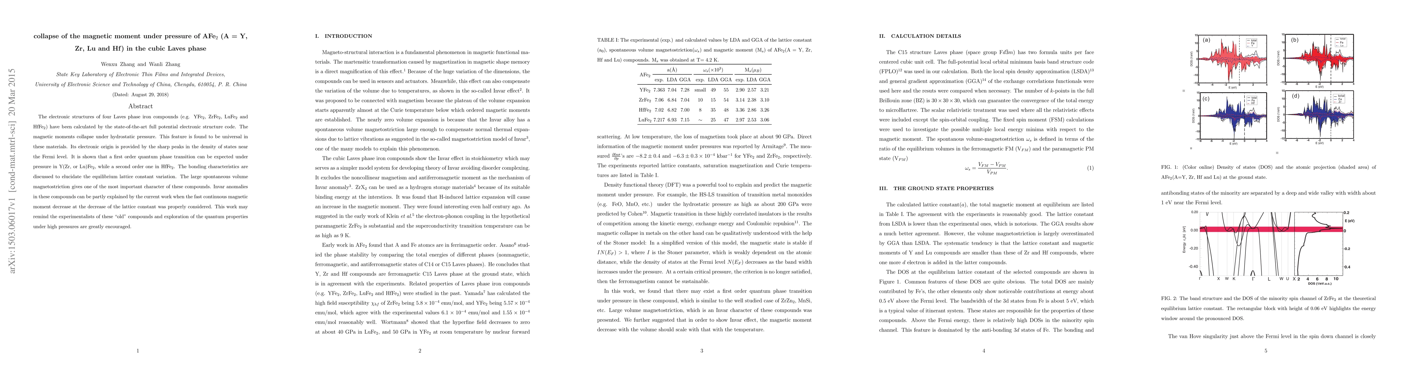 This paper investigates the electronic structures and magnetic properties of four Laves phase iron compounds under pressure, revealing a universal collapse of magnetic moments due to sharp peaks in density of states near the Fermi level. It predicts first-order quantum phase transitions in YFe$_2$, ZrFe$_2$, and LuFe$_2$, and a second-order transition in HfFe$_2$.