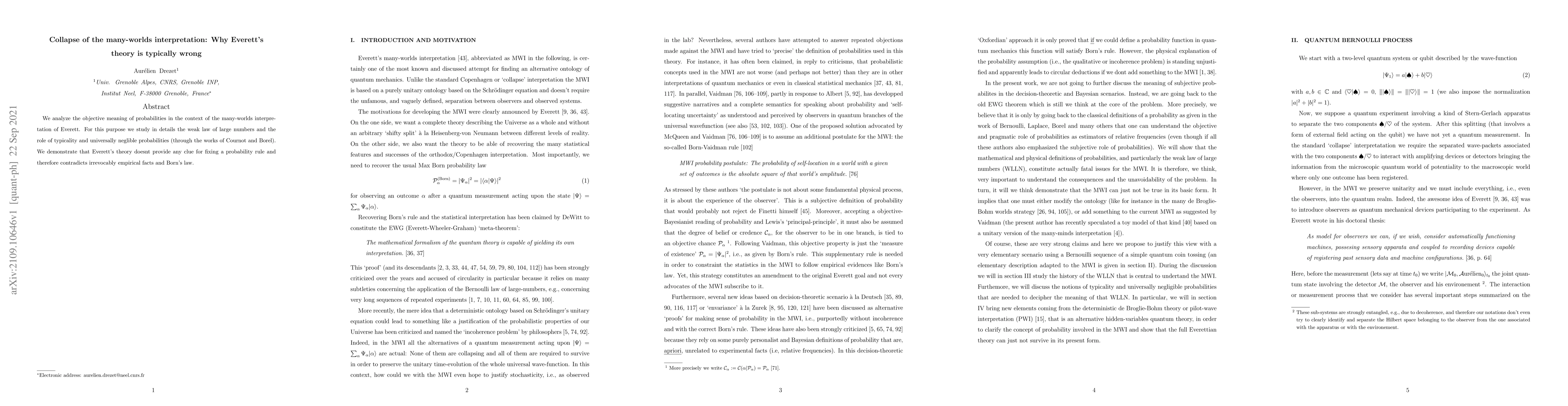 Two-line summary: This paper scrutinizes the many-worlds interpretation of Everett's theory, arguing that it fails to establish a coherent probability rule, contradicting empirical observations and Born's law. The analysis focuses on the weak law of large numbers and the concept of typicality and negligible probabilities.