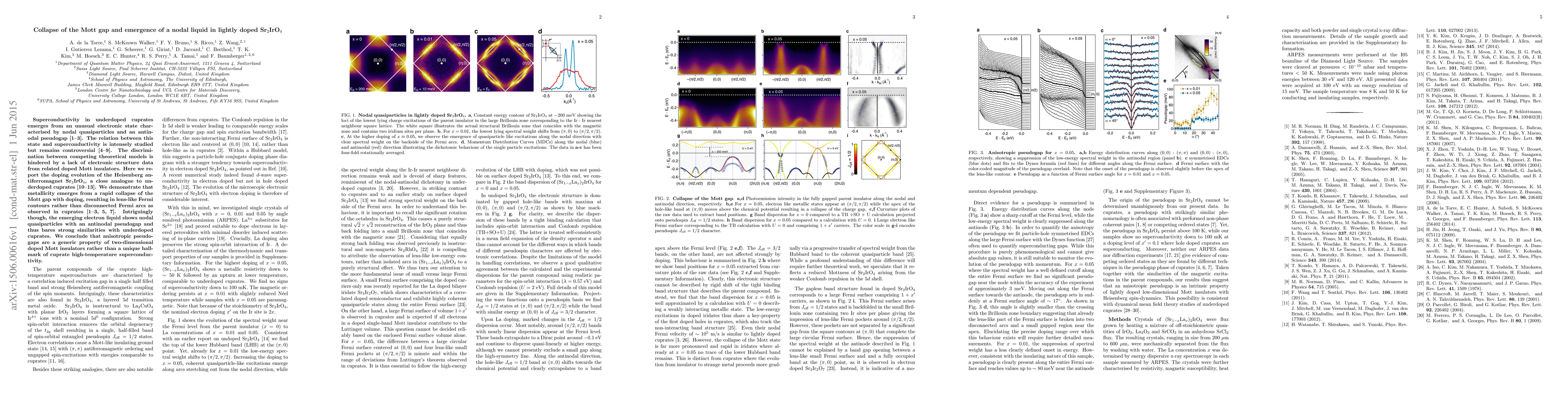 This paper investigates the electronic structure of lightly doped Sr$_2$IrO$_4$, revealing that metallicity emerges from a rapid collapse of the Mott gap, leading to a nodal liquid with an antinodal pseudogap, akin to underdoped cuprates, suggesting a broader relevance of anisotropic pseudogaps in doped Mott insulators.