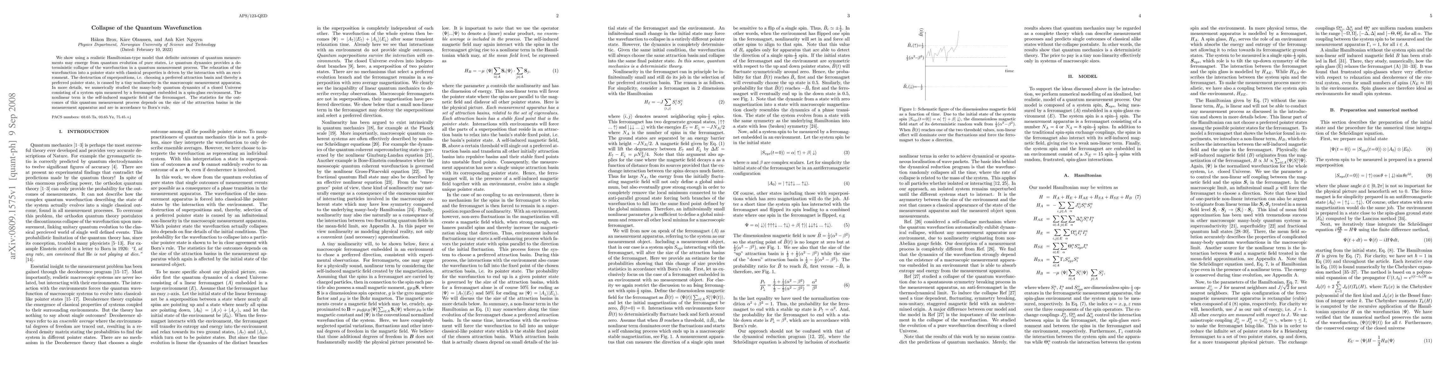We show using a realistic Hamiltonian-type model that definite outcomes of quantum measurements may emerge from quantum evolution of pure states, i.e quantum dynamics provides a deterministic collapse of the wavefunction in a quantum measurement process. The relaxation of the wavefunction into a pointer state with classical properties is driven by the interaction with an environment. The destruction of superpositions, i.e. choosing a preferred attraction basin and thereby a preferred pointer state, is caused by a tiny nonlinearity in the macroscopic measurement apparatus. In more details, we numerically studied the many-body quantum dynamics of a closed Universe consisting of a system spin measured by a ferromagnet embedded in a spin-glass environment. The nonlinear term is the self-induced magnetic field of the ferromagnet. The statistics for the outcomes of this quantum measurement process depends on the size of the attraction basins in the measurement apparatus and are in accordance to Born's rule.