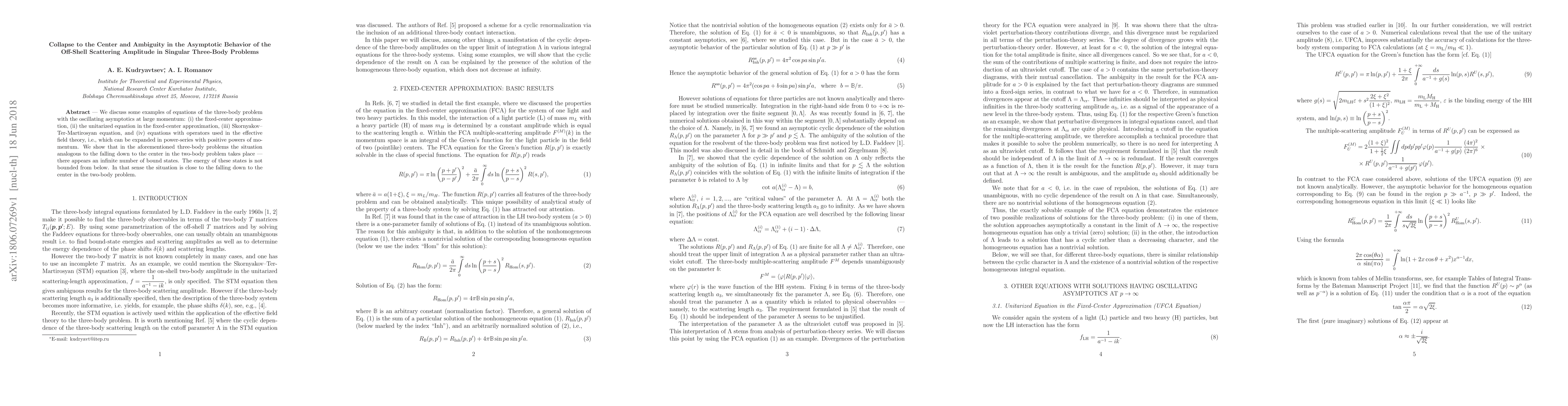 This paper examines the asymptotic behavior of off-shell scattering amplitudes in singular three-body problems, revealing an infinite number of unbounded bound states analogous to the center collapse in two-body problems. The study covers various equations, including fixed-center approximations and effective field theory models.