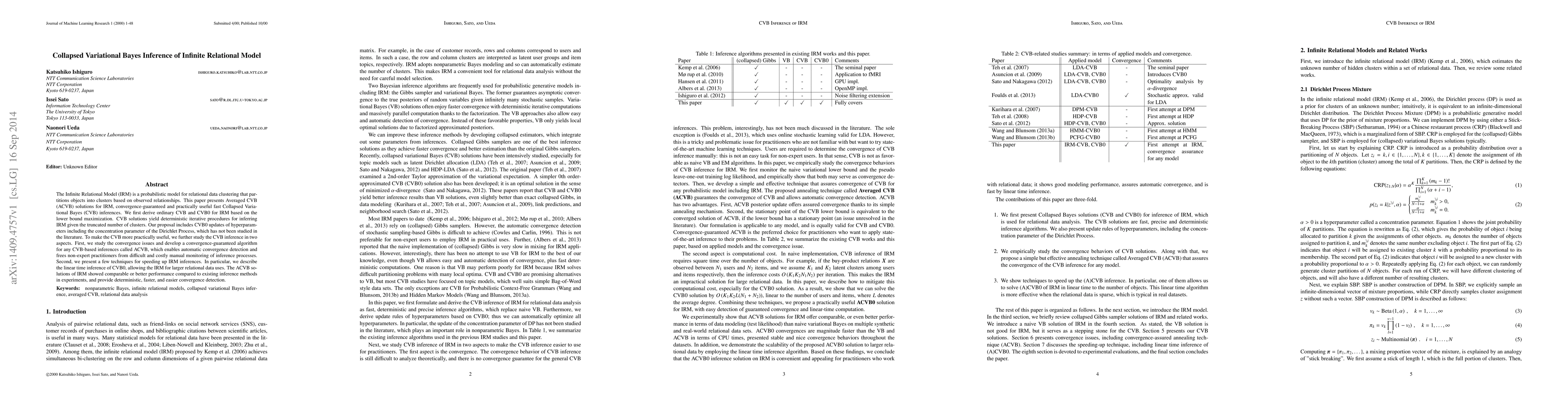 This paper proposes Averaged Collapsed Variational Bayes (ACVB) solutions for the Infinite Relational Model (IRM), offering fast and convergence-guaranteed inference methods. The ACVB algorithm automates convergence detection and speeds up inference, making it more practical for large relational data.