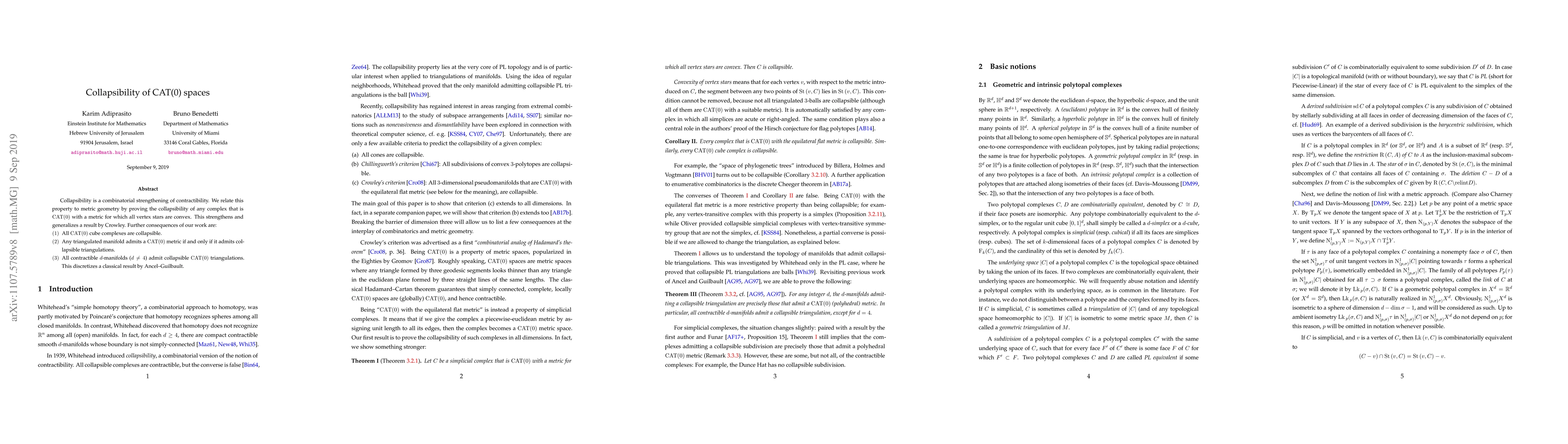 The paper proves that any CAT(0) space with convex vertex stars is collapsible, thereby generalizing previous results and showing that all CAT(0) cube complexes and contractible d-manifolds (except for d=4) admit collapsible triangulations. This establishes a metric-geometric perspective on collapsibility.
