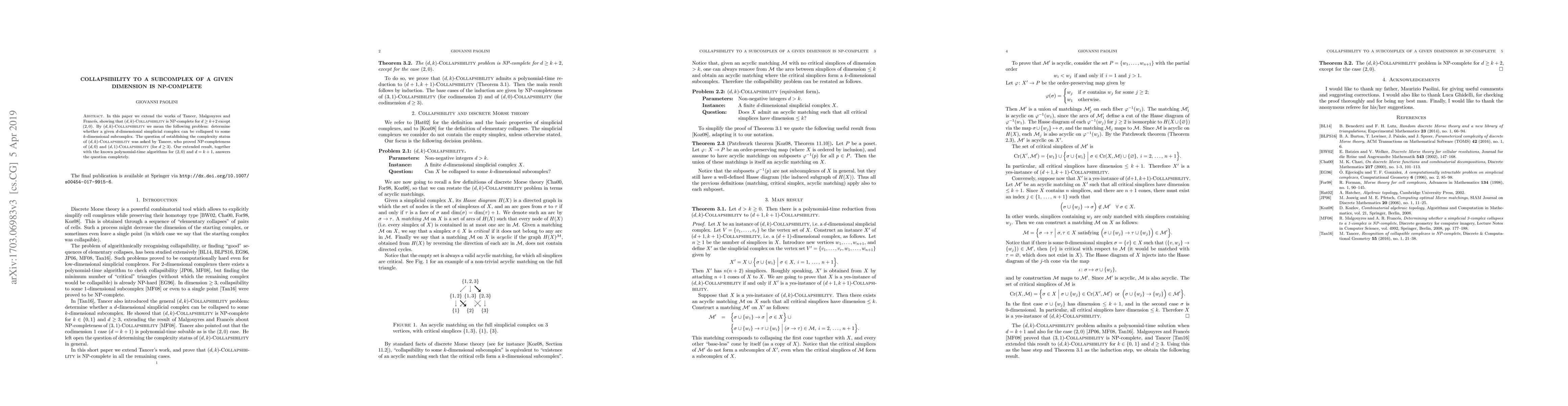 In this paper we extend the works of Tancer and of Malgouyres and Franc\'es, showing that $(d,k)$-collapsibility is NP-complete for $d\geq k+2$ except $(2,0)$. By $(d,k)$-collapsibility we mean the following problem: determine whether a given $d$-dimensional simplicial complex can be collapsed to some $k$-dimensional subcomplex. The question of establishing the complexity status of $(d,k)$-collapsibility was asked by Tancer, who proved NP-completeness of $(d,0)$ and $(d,1)$-collapsibility (for $d\geq 3$). Our extended result, together with the known polynomial-time algorithms for $(2,0)$ and $d=k+1$, answers the question completely.