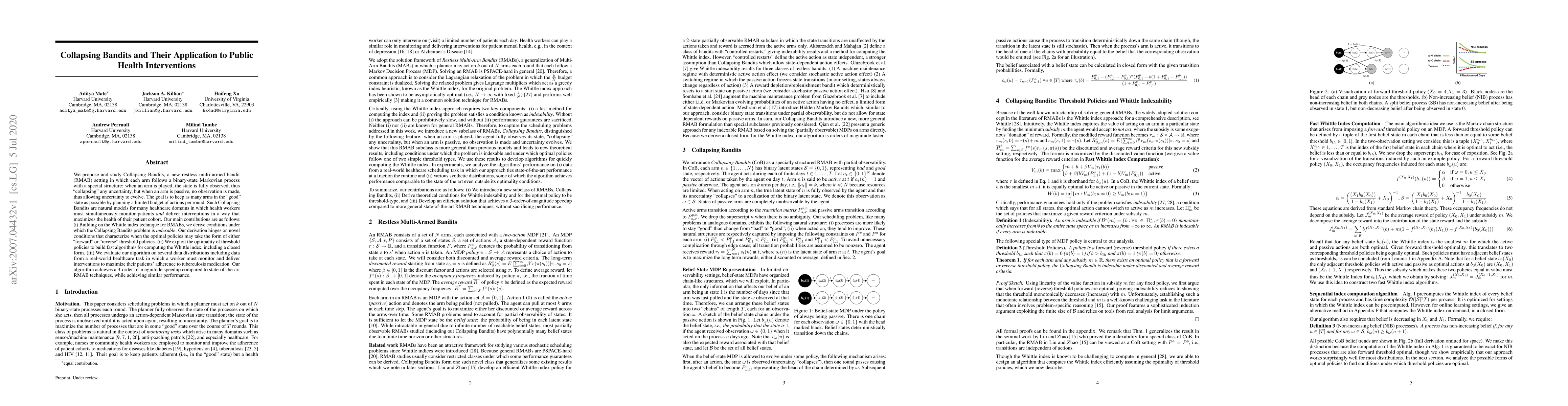 We propose and study Collpasing Bandits, a new restless multi-armed bandit (RMAB) setting in which each arm follows a binary-state Markovian process with a special structure: when an arm is played, the state is fully observed, thus "collapsing" any uncertainty, but when an arm is passive, no observation is made, thus allowing uncertainty to evolve. The goal is to keep as many arms in the "good" state as possible by planning a limited budget of actions per round. Such Collapsing Bandits are natural models for many healthcare domains in which workers must simultaneously monitor patients and deliver interventions in a way that maximizes the health of their patient cohort. Our main contributions are as follows: (i) Building on the Whittle index technique for RMABs, we derive conditions under which the Collapsing Bandits problem is indexable. Our derivation hinges on novel conditions that characterize when the optimal policies may take the form of either "forward" or "reverse" threshold policies. (ii) We exploit the optimality of threshold policies to build fast algorithms for computing the Whittle index, including a closed-form. (iii) We evaluate our algorithm on several data distributions including data from a real-world healthcare task in which a worker must monitor and deliver interventions to maximize their patients' adherence to tuberculosis medication. Our algorithm achieves a 3-order-of-magnitude speedup compared to state-of-the-art RMAB techniques while achieving similar performance.