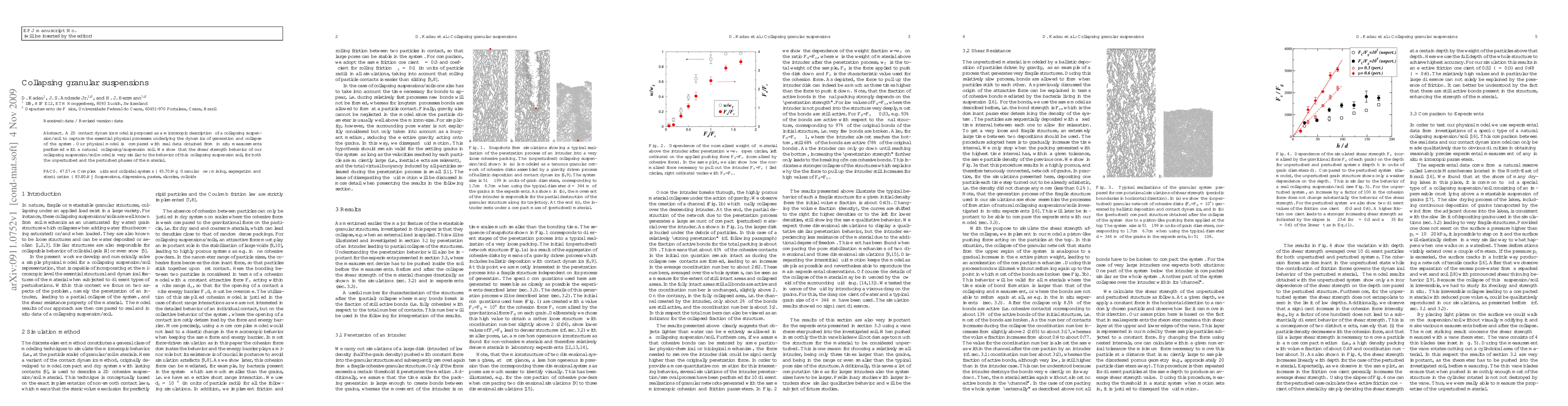 A 2D contact dynamics model is proposed as a microscopic description of a collapsing suspension/soil to capture the essential physical processes underlying the dynamics of generation and collapse of the system. Our physical model is compared with real data obtained from in situ measurements performed with a natural collapsing/suspension soil. We show that the shear strength behavior of our collapsing suspension/soil model is very similar to the behavior of this collapsing suspension soil, for both the unperturbed and the perturbed phases of the material.