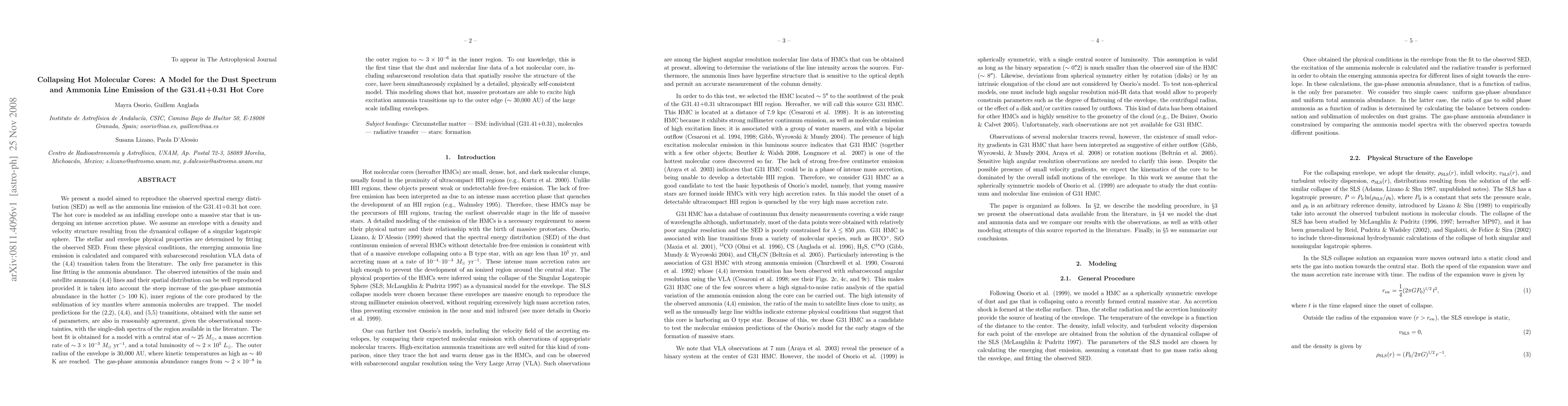 The paper presents a model explaining the observed spectral energy distribution (SED) and ammonia line emission of the G31.41+0.31 hot core, modeling it as an infalling envelope around a massive, accreting star. The model successfully reproduces the ammonia line properties and spatial distribution by considering a steep increase in ammonia abundance in hotter inner regions due to icy mantle sublimation. The best-fit model features a 25 solar mass star, a mass accretion rate of 0.003 solar masses per year, and a total luminosity of 200,000 solar luminosities. The gas-phase ammonia abundance varies from 2 × 10^-8 to 3 × 10^-6 across the core. This is the first model to simultaneously explain both dust and molecular line data of a hot molecular core with subarcsecond resolution, demonstrating that massive protostars can excite high-excitation ammonia transitions up to the outer edge of large-scale envelopes.