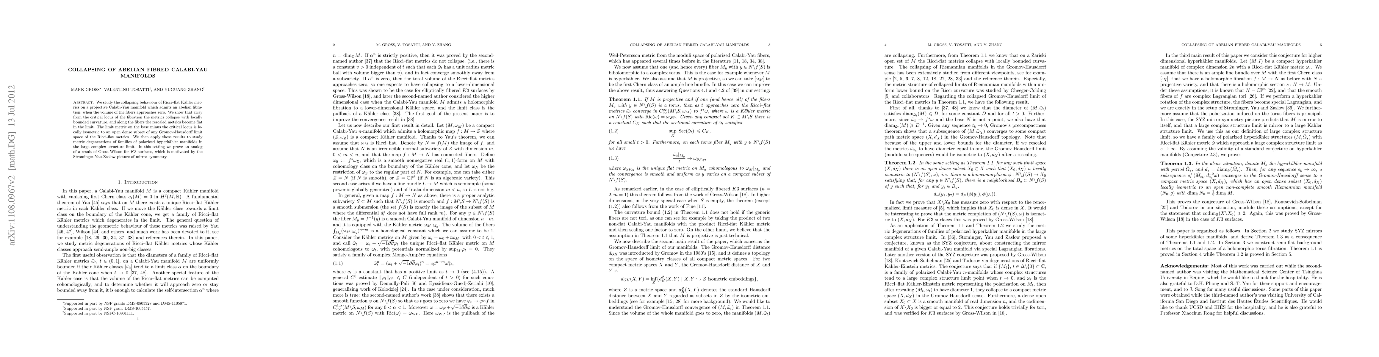 This paper explores the collapsing behavior of Ricci-flat Kähler metrics on Calabi-Yau manifolds with abelian fibrations as the fiber volume approaches zero. It demonstrates that metrics collapse with bounded curvature away from the fibration's critical locus, and become flat along the fibers.