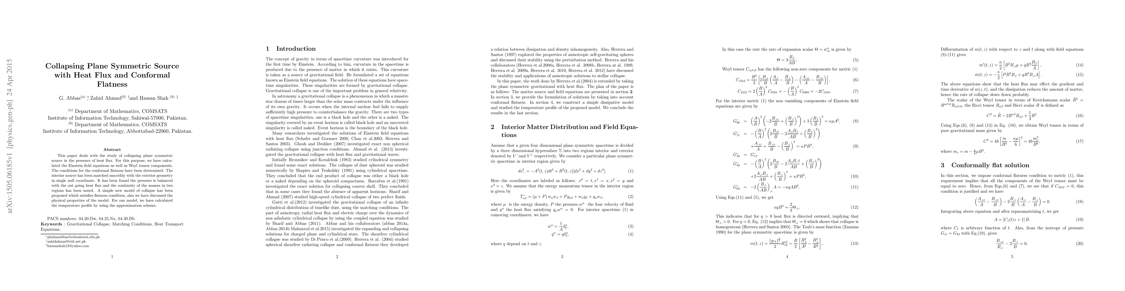 This paper deals with the study of collapsing plane symmetric source in the presence of heat flux. For this purpose, we have calculated the Einstein field equations as well as Weyl tensor components. The conditions for the conformal flatness have been determined. The interior source has been matched smoothly with the exterior geometry in single null coordinate. It has been found the pressure is balanced with the out going heat flux and the continuity of the masses in two regions has been noted. A simple new model of collapse has been proposed which satisfies flatness condition, also we have discussed the physical properties of the model. For our model, we have calculated the temperature profile by using the approximation scheme.