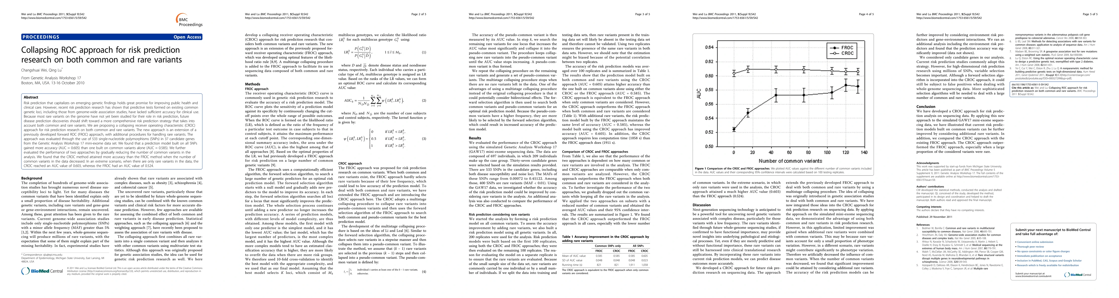 Risk prediction that capitalizes on emerging genetic findings holds great promise for improving public health and clinical care. However, recent risk prediction research has shown that predictive tests formed on existing common genetic loci, including those from genome-wide association studies, have lacked sufficient accuracy for clinical use. Because most rare variants on the genome have not yet been studied for their role in risk prediction, future disease prediction discoveries should shift toward a more comprehensive risk prediction strategy that takes into account both common and rare variants. We are proposing a collapsing receiver operating characteristic CROC approach for risk prediction research on both common and rare variants. The new approach is an extension of a previously developed forward ROC FROC approach, with additional procedures for handling rare variants. The approach was evaluated through the use of 533 single-nucleotide polymorphisms SNPs in 37 candidate genes from the Genetic Analysis Workshop 17 mini-exome data set. We found that a prediction model built on all SNPs gained more accuracy AUC = 0.605 than one built on common variants alone AUC = 0.585. We further evaluated the performance of two approaches by gradually reducing the number of common variants in the analysis. We found that the CROC method attained more accuracy than the FROC method when the number of common variants in the data decreased. In an extreme scenario, when there are only rare variants in the data, the CROC reached an AUC value of 0.603, whereas the FROC had an AUC value of 0.524.
