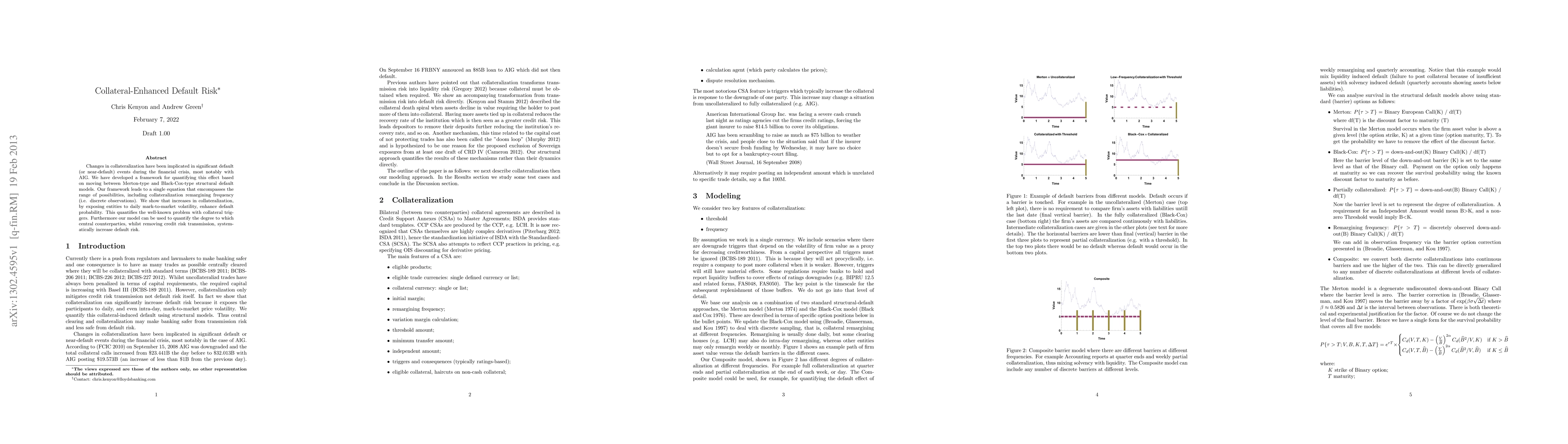 Changes in collateralization have been implicated in significant default (or near-default) events during the financial crisis, most notably with AIG. We have developed a framework for quantifying this effect based on moving between Merton-type and Black-Cox-type structural default models. Our framework leads to a single equation that emcompasses the range of possibilities, including collateralization remargining frequency (i.e. discrete observations). We show that increases in collateralization, by exposing entities to daily mark-to-market volatility, enhance default probability. This quantifies the well-known problem with collateral triggers. Furthermore our model can be used to quantify the degree to which central counterparties, whilst removing credit risk transmission, systematically increase default risk.