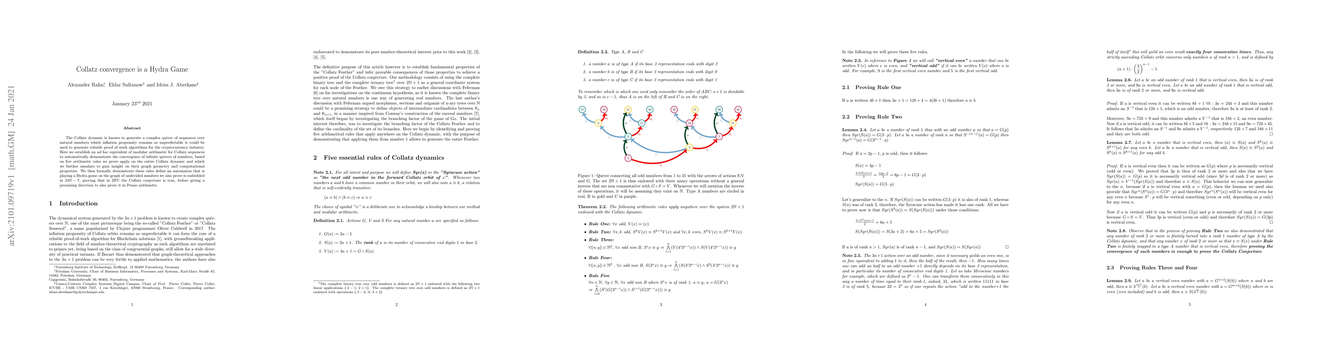 The Collatz dynamic is known to generate a complex quiver of sequences over natural numbers which inflation propensity remains so unpredictable it could be used to generate reliable proof of work algorithms for the cryptocurrency industry. Here we establish an ad hoc equivalent of modular arithmetic for Collatz sequences to automatically demonstrate the convergence of infinite quivers of numbers, based on five arithmetic rules we prove apply on the entire Collatz dynamic and which we further simulate to gain insight on their graph geometry and computational properties. We then formally demonstrate these rules define an automaton that is playing a Hydra game on the graph of undecided numbers we also prove is embedded in 24N-7, proving that in ZFC the Collatz conjecture is true, before giving a promising direction to also prove it in Peano arithmetic.