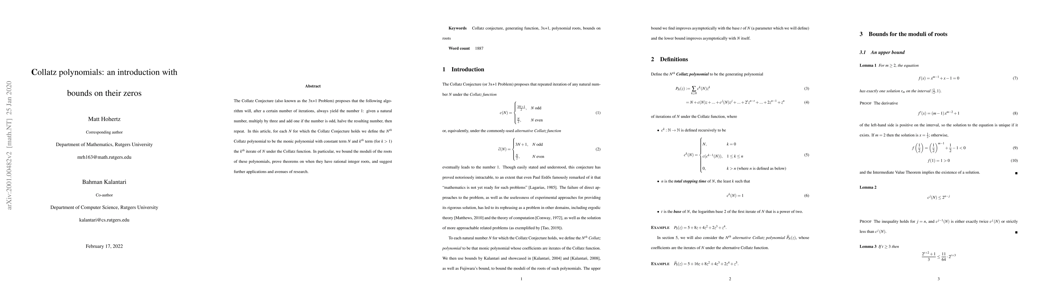 The Collatz Conjecture (also known as the 3x+1 Problem) proposes that the following algorithm will, after a certain number of iterations, always yield the number 1: given a natural number, multiply by three and add one if the number is odd, halve the resulting number, then repeat. In this article, for each $N$ for which the Collatz Conjecture holds we define the $N^{th}$ Collatz polynomial to be the monic polynomial with constant term $N$ and $k^{th}$ term (for $k > 1$) the $k^{th}$ iterate of $N$ under the Collatz function. In particular, we bound the moduli of the roots of these polynomials, prove theorems on when they have rational integer roots, and suggest further applications and avenues of research.