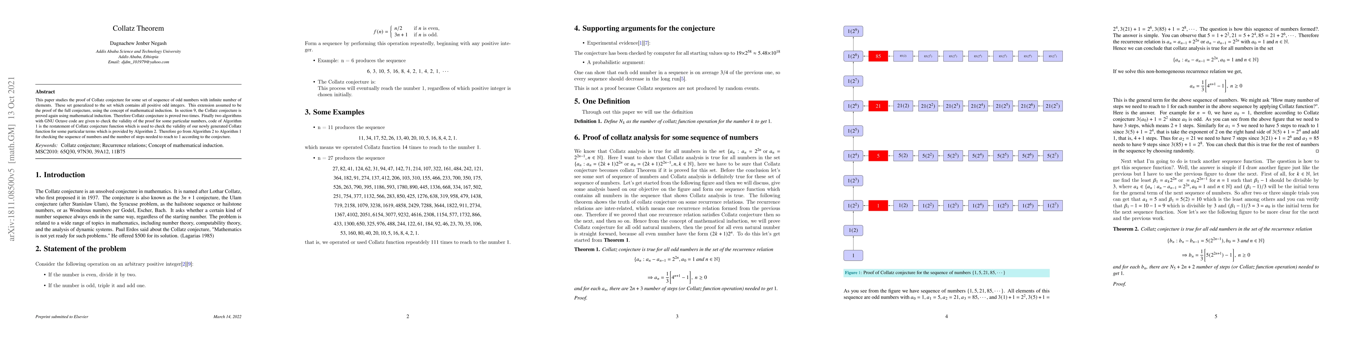 This paper studies the proof of Collatz conjecture for some set of sequence of odd numbers with infinite number of elements. These set generalized to the set which contains all positive odd integers. This extension assumed to be the proof of the full conjecture, using the concept of mathematical induction. In section 9, the Collatz conjecture is proved again using mathematical induction. Therefore Collatz conjecture is proved two times. Finally two algorithms with GNU Octave code are given to check the validity of the proof for some particular numbers, code of Algorithm 1 is the restatement of Collatz conjecture function which is used to check the validity of our newly generated Collatz function for some particular terms which is provided by Algorithm 2. Therefore go from Algorithm 2 to Algorithm 1 for checking the sequence of numbers and the number of steps needed to reach to 1 according to the conjecture.