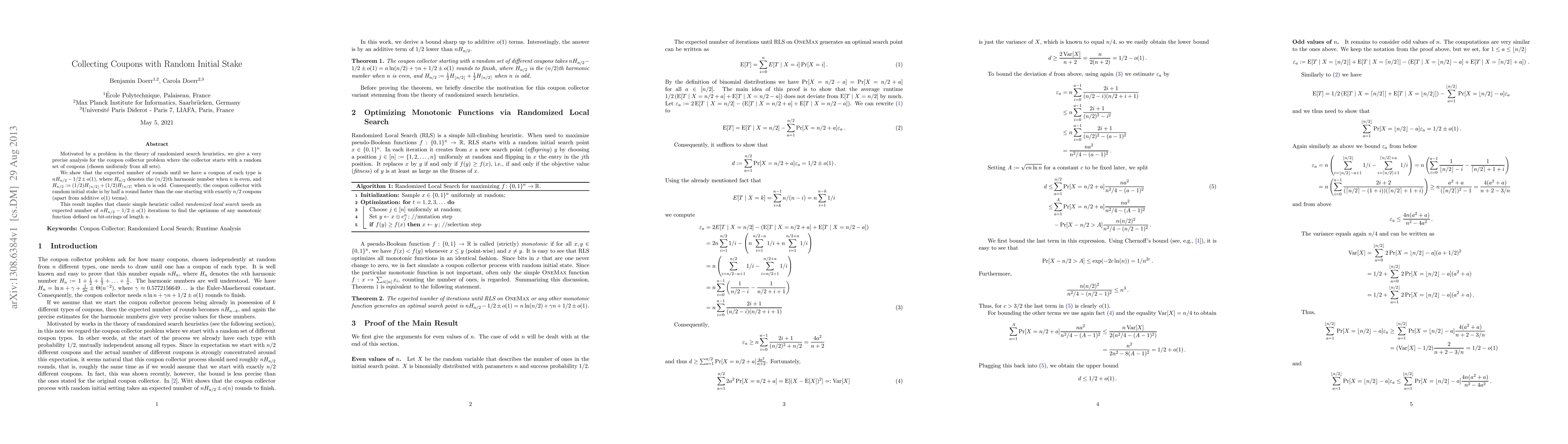 Motivated by a problem in the theory of randomized search heuristics, we give a very precise analysis for the coupon collector problem where the collector starts with a random set of coupons (chosen uniformly from all sets). We show that the expected number of rounds until we have a coupon of each type is $nH_{n/2} - 1/2 \pm o(1)$, where $H_{n/2}$ denotes the $(n/2)$th harmonic number when $n$ is even, and $H_{n/2}:= (1/2) H_{\lfloor n/2 \rfloor} + (1/2) H_{\lceil n/2 \rceil}$ when $n$ is odd. Consequently, the coupon collector with random initial stake is by half a round faster than the one starting with exactly $n/2$ coupons (apart from additive $o(1)$ terms). This result implies that classic simple heuristic called \emph{randomized local search} needs an expected number of $nH_{n/2} - 1/2 \pm o(1)$ iterations to find the optimum of any monotonic function defined on bit-strings of length $n$.