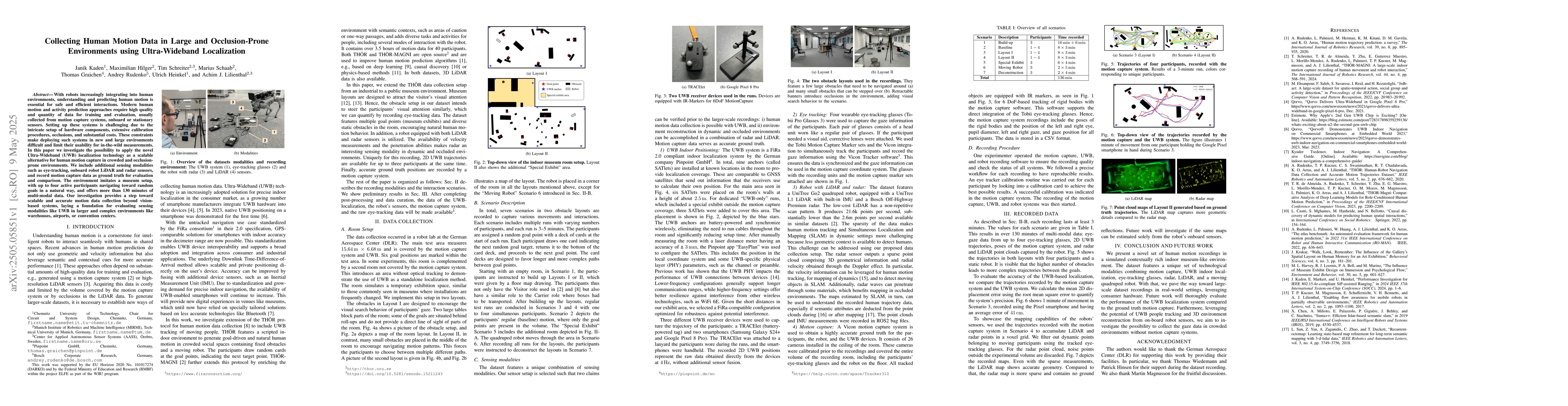 With robots increasingly integrating into human environments, understanding and predicting human motion is essential for safe and efficient interactions. Modern human motion and activity prediction approaches require high quality and quantity of data for training and evaluation, usually collected from motion capture systems, onboard or stationary sensors. Setting up these systems is challenging due to the intricate setup of hardware components, extensive calibration procedures, occlusions, and substantial costs. These constraints make deploying such systems in new and large environments difficult and limit their usability for in-the-wild measurements. In this paper we investigate the possibility to apply the novel Ultra-Wideband (UWB) localization technology as a scalable alternative for human motion capture in crowded and occlusion-prone environments. We include additional sensing modalities such as eye-tracking, onboard robot LiDAR and radar sensors, and record motion capture data as ground truth for evaluation and comparison. The environment imitates a museum setup, with up to four active participants navigating toward random goals in a natural way, and offers more than 130 minutes of multi-modal data. Our investigation provides a step toward scalable and accurate motion data collection beyond vision-based systems, laying a foundation for evaluating sensing modalities like UWB in larger and complex environments like warehouses, airports, or convention centers.