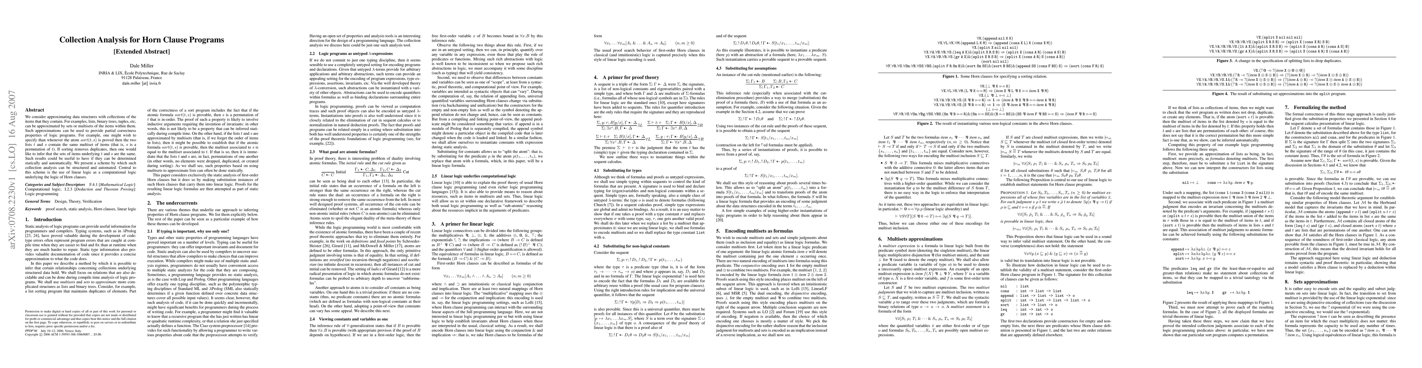 This paper proposes a method to approximate data structures like lists and trees with sets or multisets to infer partial correctness properties in logic programs. It uses linear logic as a computational framework to automate the collection analysis for Horn clause programs.