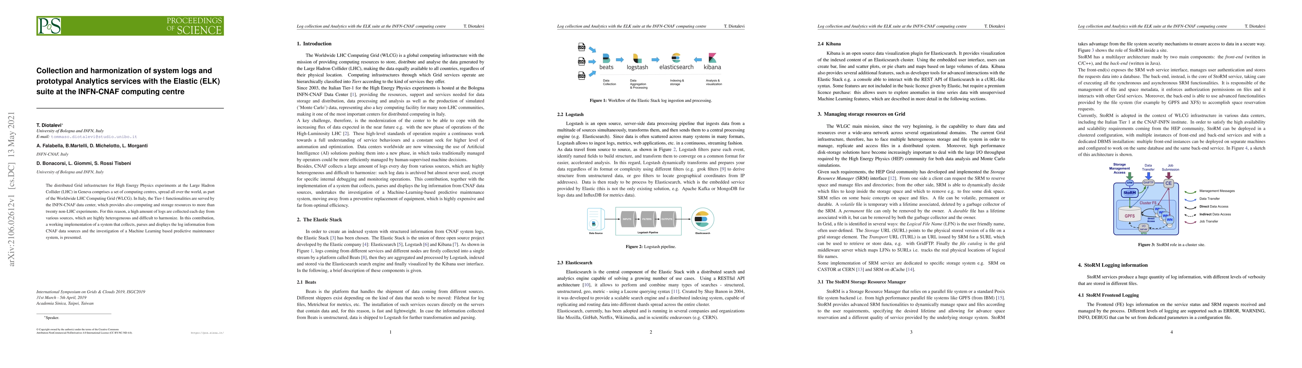 The distributed Grid infrastructure for High Energy Physics experiments at the Large Hadron Collider (LHC) in Geneva comprises a set of computing centres, spread all over the world, as part of the Worldwide LHC Computing Grid (WLCG). In Italy, the Tier-1 functionalities are served by the INFN-CNAF data center, which provides also computing and storage resources to more than twenty non-LHC experiments. For this reason, a high amount of logs are collected each day from various sources, which are highly heterogeneous and difficult to harmonize. In this contribution, a working implementation of a system that collects, parses and displays the log information from CNAF data sources and the investigation of a Machine Learning based predictive maintenance system, is presented.