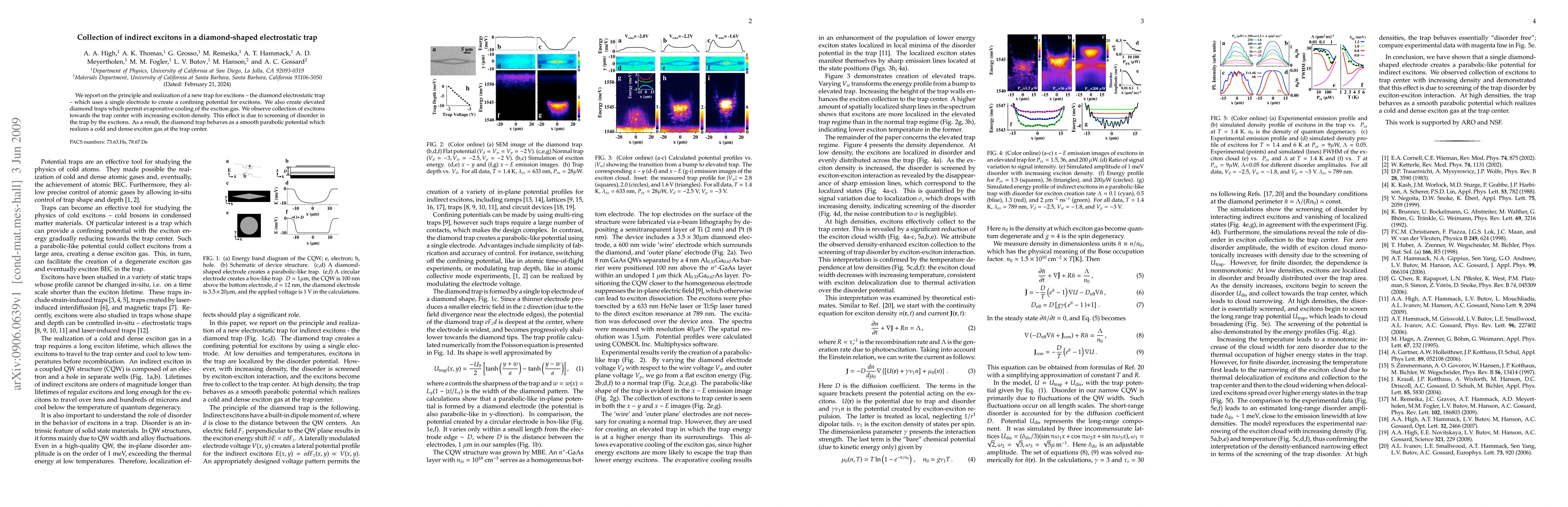 The paper describes a diamond-shaped electrostatic trap for excitons, utilizing a single electrode to confine excitons, and reports the collection of excitons towards the trap center due to disorder screening, resulting in a cold and dense exciton gas. Elevated diamond traps facilitate evaporative cooling of the exciton gas.
