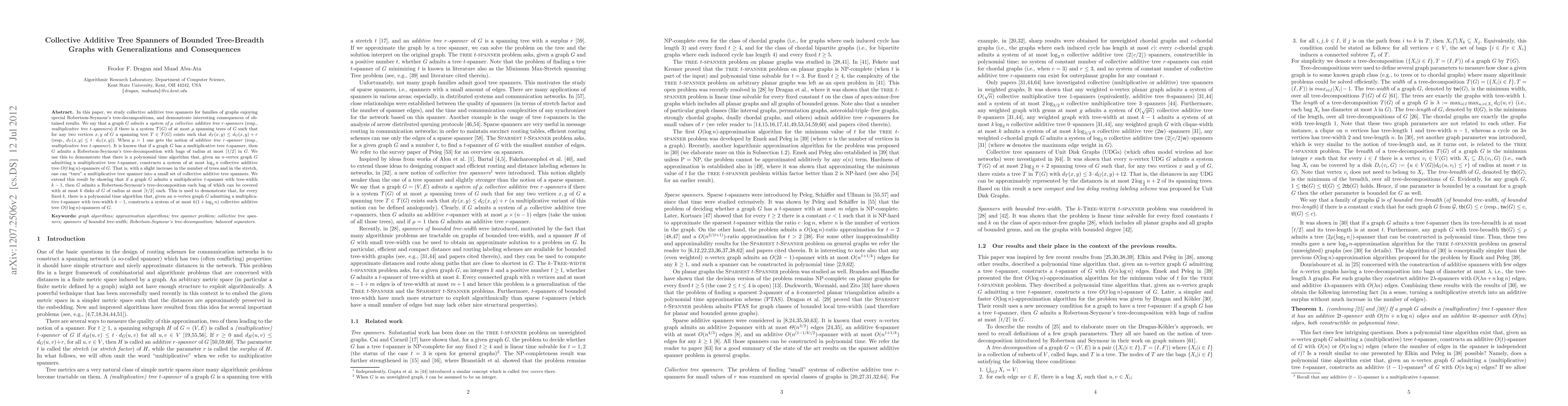 In this paper, we study collective additive tree spanners for families of graphs enjoying special Robertson-Seymour's tree-decompositions, and demonstrate interesting consequences of obtained results. We say that a graph $G$ {\em admits a system of $\mu$ collective additive tree $r$-spanners} (resp., {\em multiplicative tree $t$-spanners}) if there is a system $\cT(G)$ of at most $\mu$ spanning trees of $G$ such that for any two vertices $x,y$ of $G$ a spanning tree $T\in \cT(G)$ exists such that $d_T(x,y)\leq d_G(x,y)+r$ (resp., $d_T(x,y)\leq t\cdot d_G(x,y)$). When $\mu=1$ one gets the notion of {\em additive tree $r$-spanner} (resp., {\em multiplicative tree $t$-spanner}). It is known that if a graph $G$ has a multiplicative tree $t$-spanner, then $G$ admits a Robertson-Seymour's tree-decomposition with bags of radius at most $\lceil{t/2}\rceil$ in $G$. We use this to demonstrate that there is a polynomial time algorithm that, given an $n$-vertex graph $G$ admitting a multiplicative tree $t$-spanner, constructs a system of at most $\log_2 n$ collective additive tree $O(t\log n)$-spanners of $G$. That is, with a slight increase in the number of trees and in the stretch, one can "turn" a multiplicative tree spanner into a small set of collective additive tree spanners. We extend this result by showing that if a graph $G$ admits a multiplicative $t$-spanner with tree-width $k-1$, then $G$ admits a Robertson-Seymour's tree-decomposition each bag of which can be covered with at most $k$ disks of $G$ of radius at most $\lceil{t/2}\rceil$ each. This is used to demonstrate that, for every fixed $k$, there is a polynomial time algorithm that, given an $n$-vertex graph $G$ admitting a multiplicative $t$-spanner with tree-width $k-1$, constructs a system of at most $k(1+ \log_2 n)$ collective additive tree $O(t\log n)$-spanners of $G$.